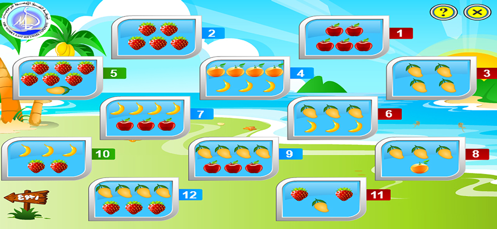 عزيزي المستخدم مرحبًا بك مع لعبة (تحدي الأذكاء) تتكون لعبة تحدي الأذكياء من أربعة مربعات متساوية الحجم، يوجد في كل مربع مجموعة من العناصر (الفواكه)، تختلف في موقعها وعددها وأنواعها من مربع إلى أخر، كما يوجد أربعة قطع هندسية مختلفة الشكل، تُستخدم في إظهار عدد معين من العناصر (الفواكه)، والمطلوب إظهارها في كل سؤال، وذلك عن طريق وضعها في المربعات المخصصة لها بوضعيات تختلف من سؤال لأخر، وبوضع القطع الهندسية الأربعة بشكل صحيح، تظهر لك الإجابة الصحيحة للسؤال.