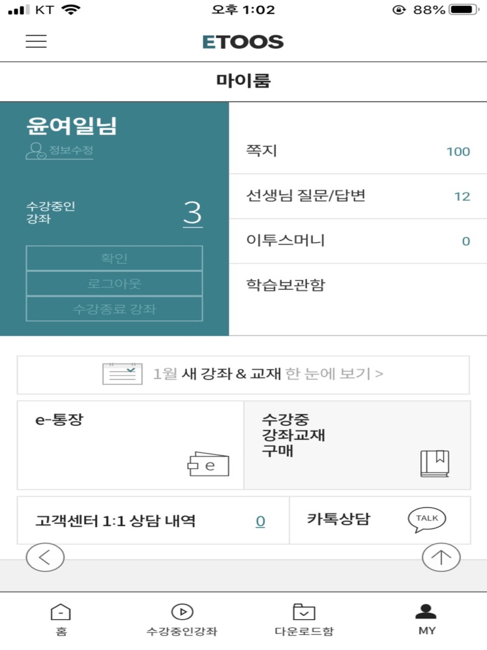 - 쪽지, 선생님 질문/답변, 이투스 할인권, 학습보관함을 이용할 수 있어요.