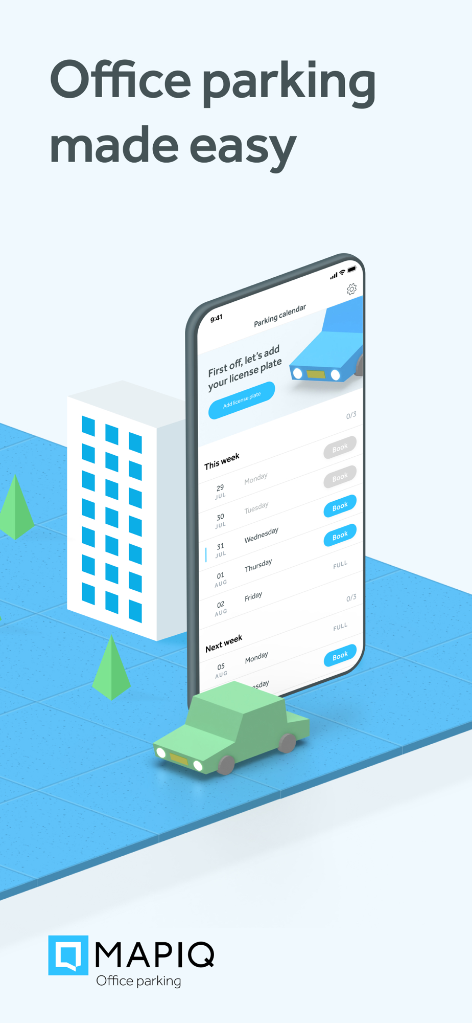 With Mapiq Office Parking, you can easily book a parking spot at your office. Before you go to the office with your car, make sure you have booked a parking spot.