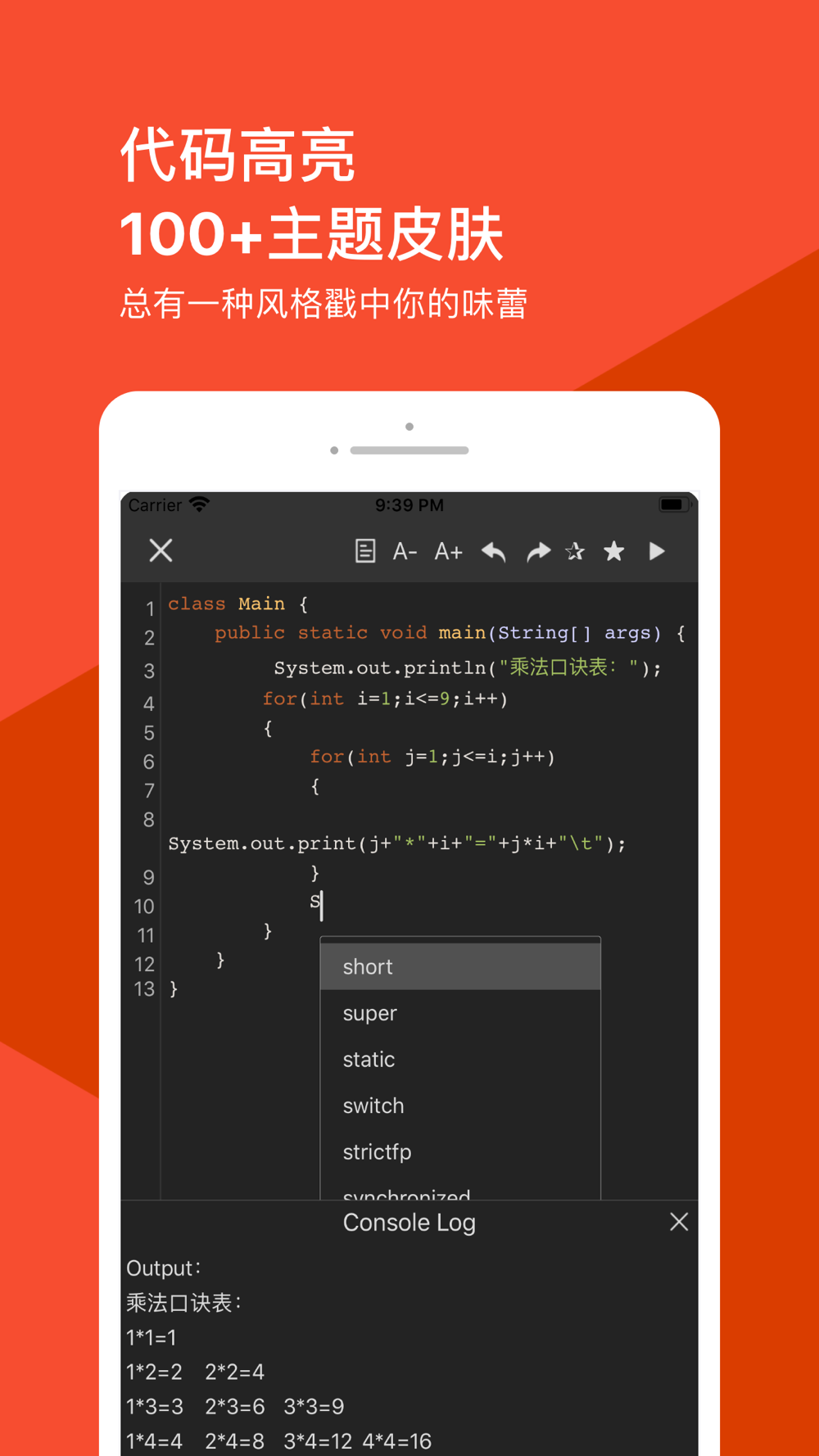 The Ai compiler supports 40+ popular programming language code compiling and running, and provides more than 100 programming theme skins, so that developers can program on the mobile phone, and learn programming anytime, anywhere.