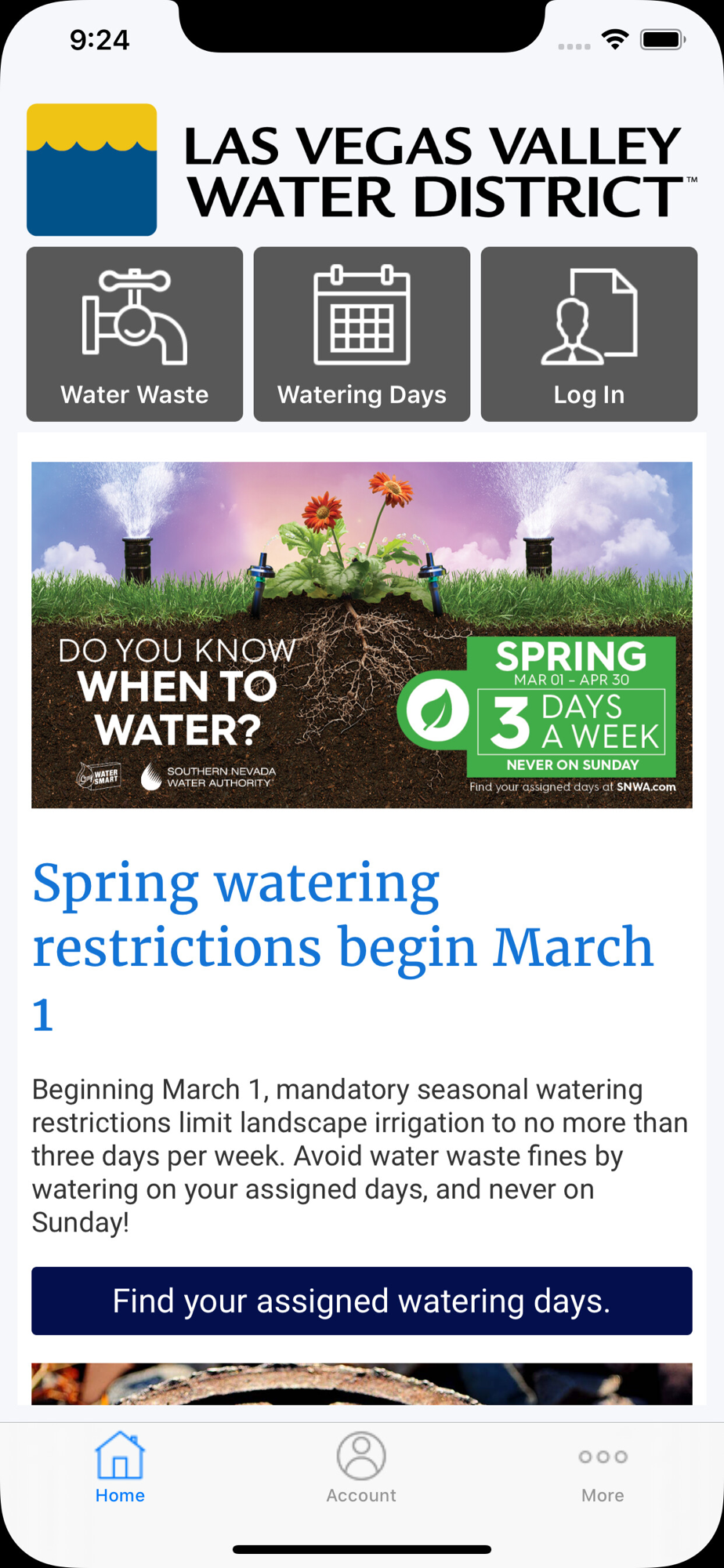 The Las Vegas Valley Water District app allows customers to view and pay their bills, see water usage history, find their assigned watering days and report water waste, all while on the go. Customers also may opt in to receive important bill and conservation-related notifications.