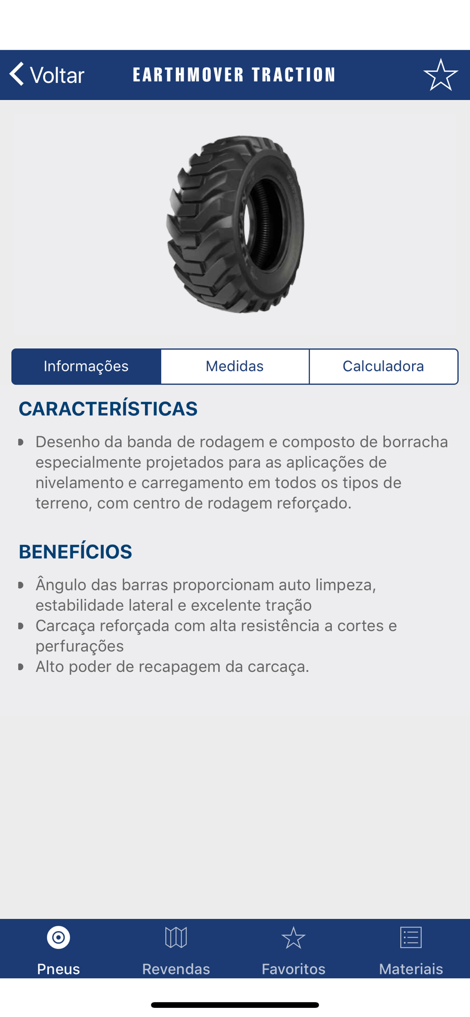 Aplicativo para consulta de portfólio de produtos da Titan Pneus, com opção de cálculo de pressão e consulta de revendas.