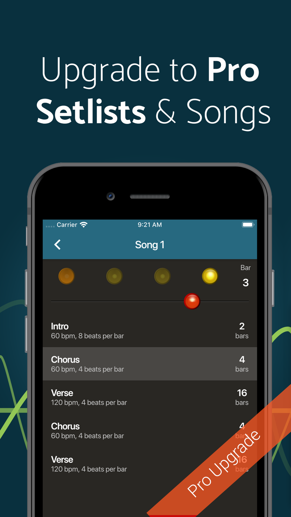 In the pro version of Metronome Beats you can save your Settings as Presets to access later. You can use these to create song of varying tempos or generate setlists of songs and play through these one by one – useful for solo and group practice as well as playing live on stage.