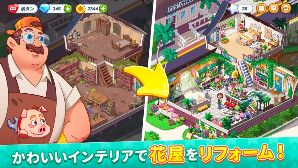 開始早々でいきなりの閉店危機?!でも、大丈夫!パズルでスターを集めると、花屋をリフォームできるよ~