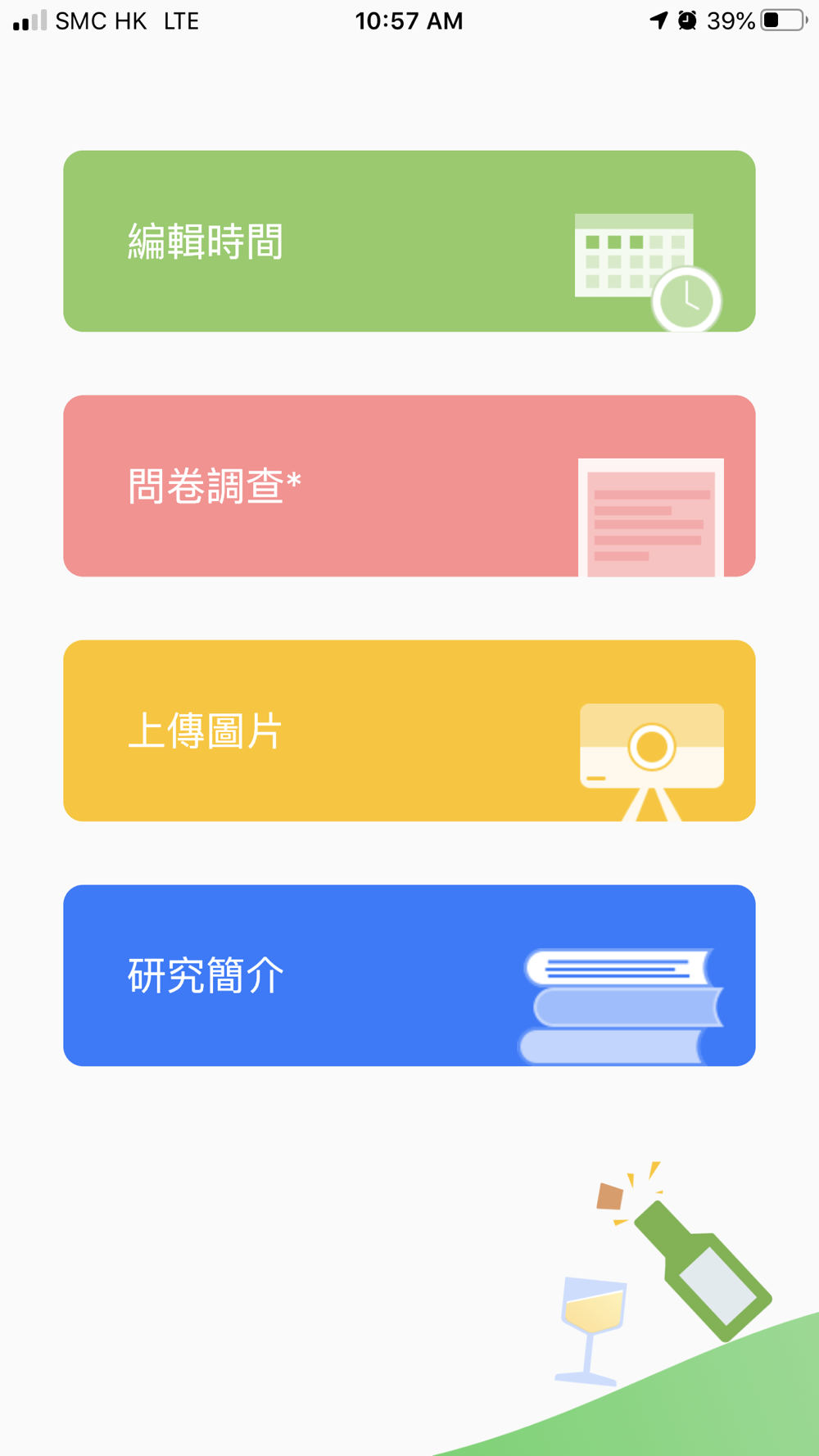 「港大飲酒研究」由香港大學李嘉誠醫學院護理學院及公共衛生學院開發,邀請有飲酒習慣人士記錄飲酒次數及種類,及他們接觸酒類廣告及飲酒文化的媒體公佈的有關數字,以作數據分析。