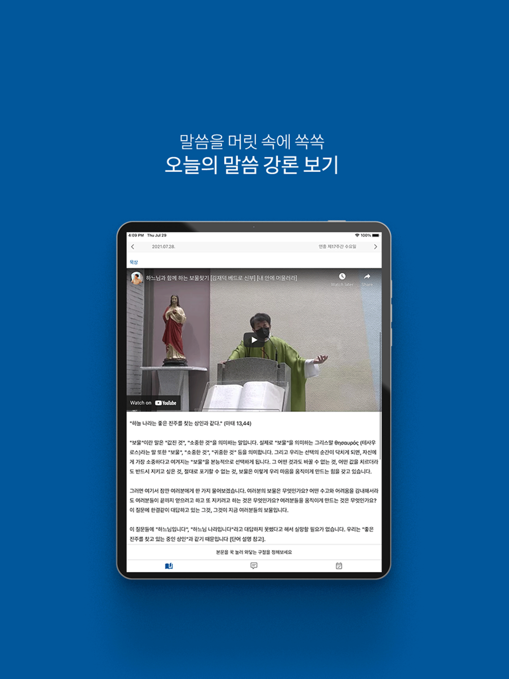 뿐만 아니라 성경본문에서 중요한 단어나 구절에 대한 해설을 볼 수 있어서 말씀을 이해하고 묵상하는데 큰 도움을 받을 수 있습니다. 또한 신부님의 강론말씀과 강론영상을 통해 말씀에 대한 깊은 묵상을 하실 수 있습니다.
