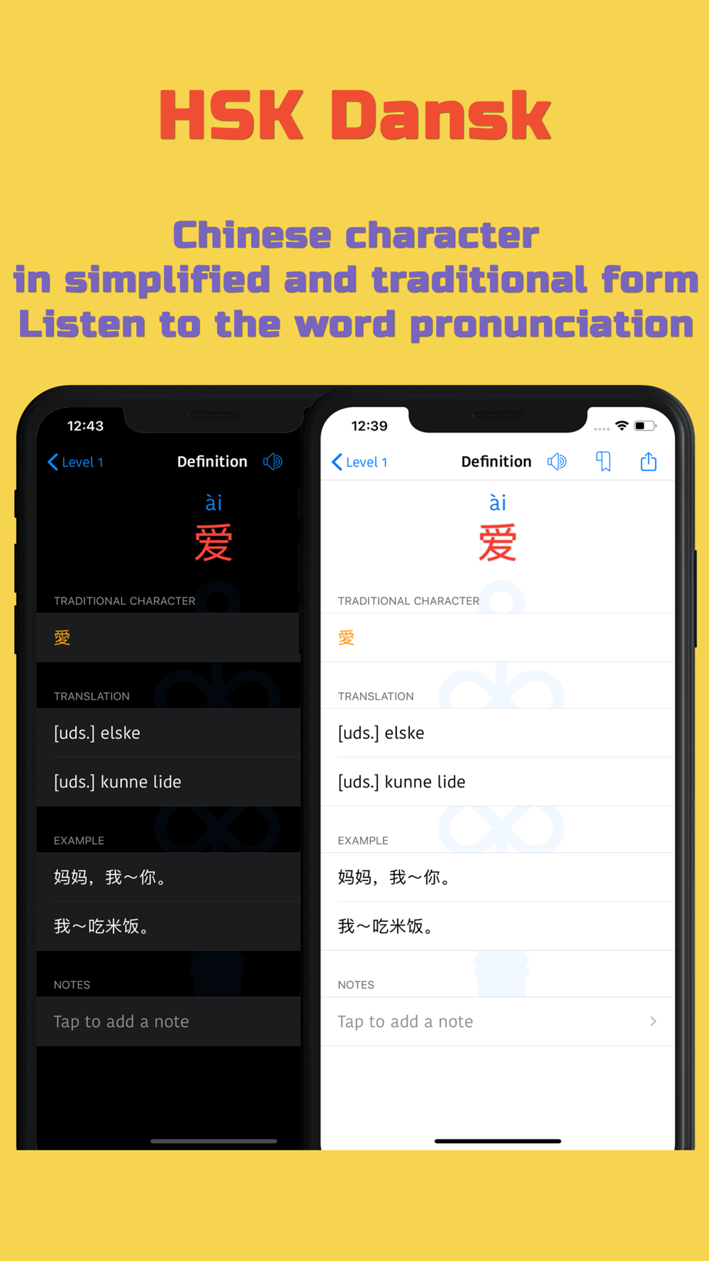 • Chinese character in Simplified and Traditional form, pinyin and English definitions
