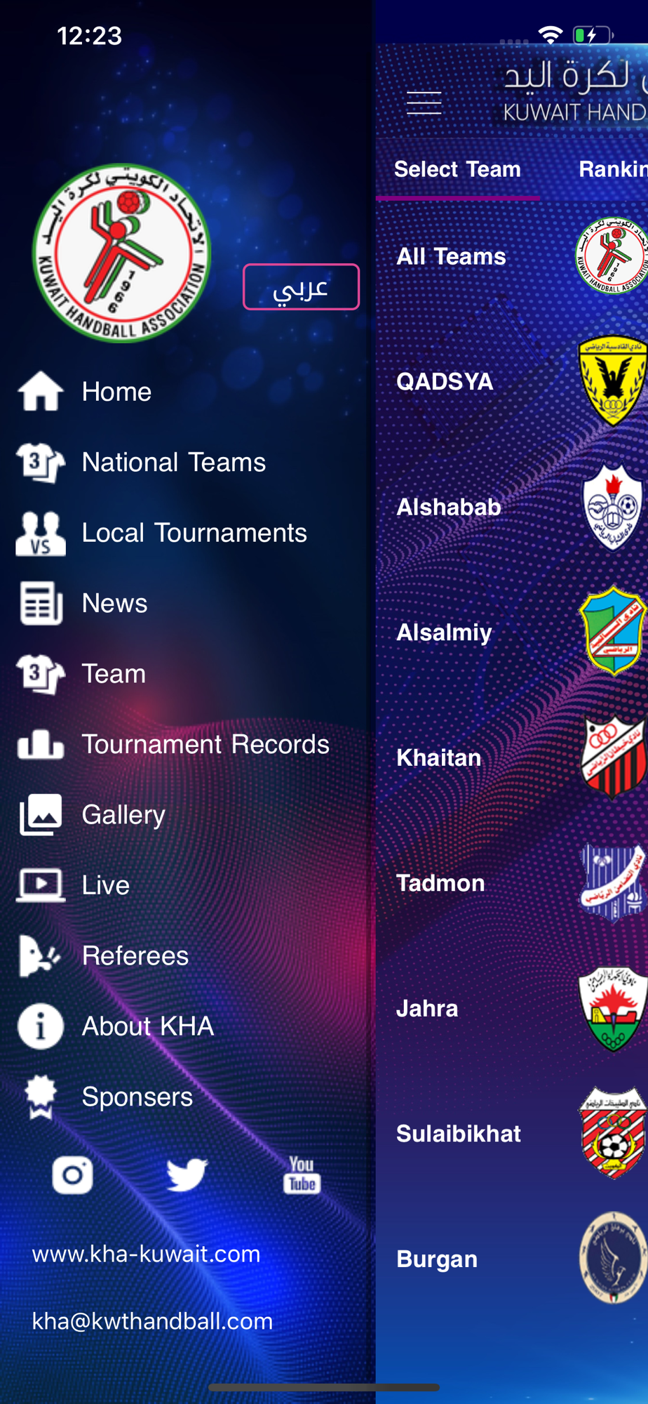 The application displays next matches previous marches' results and teams' order for all age categories. The application supports both English and Arabic languages.