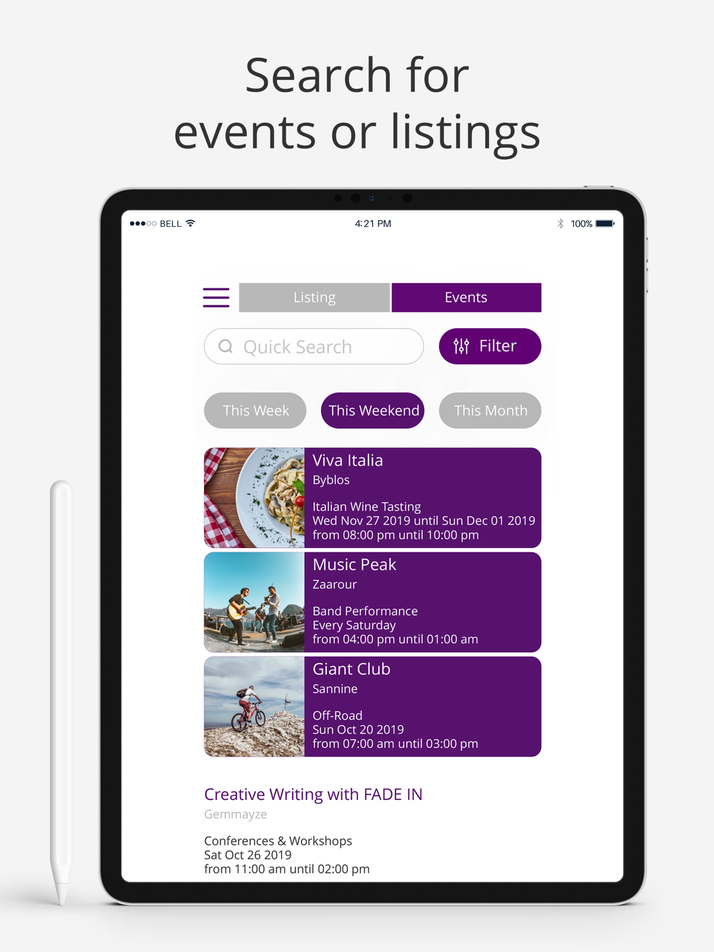 - Search for local events, lodging, exhibitions, food markets, workshops, concerts, plays, indoor and outdoor activities, kids activities, restaurants, bars, and pubs….