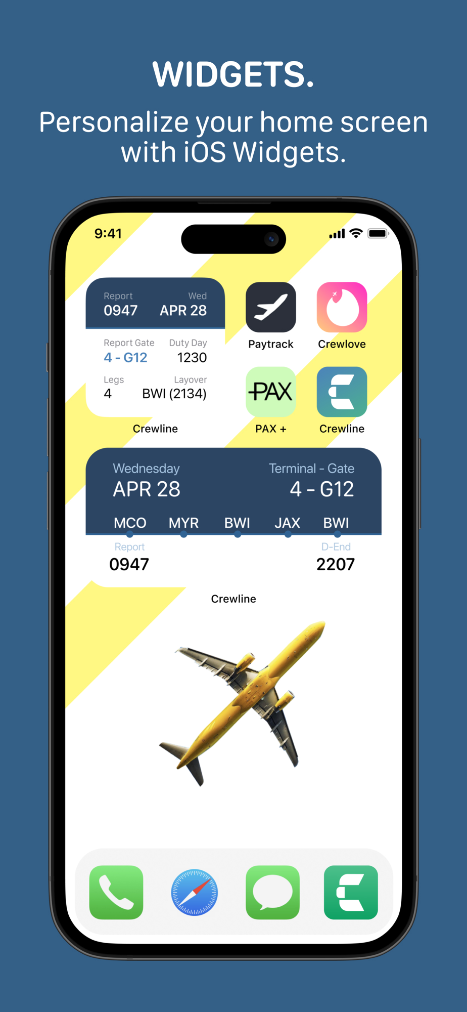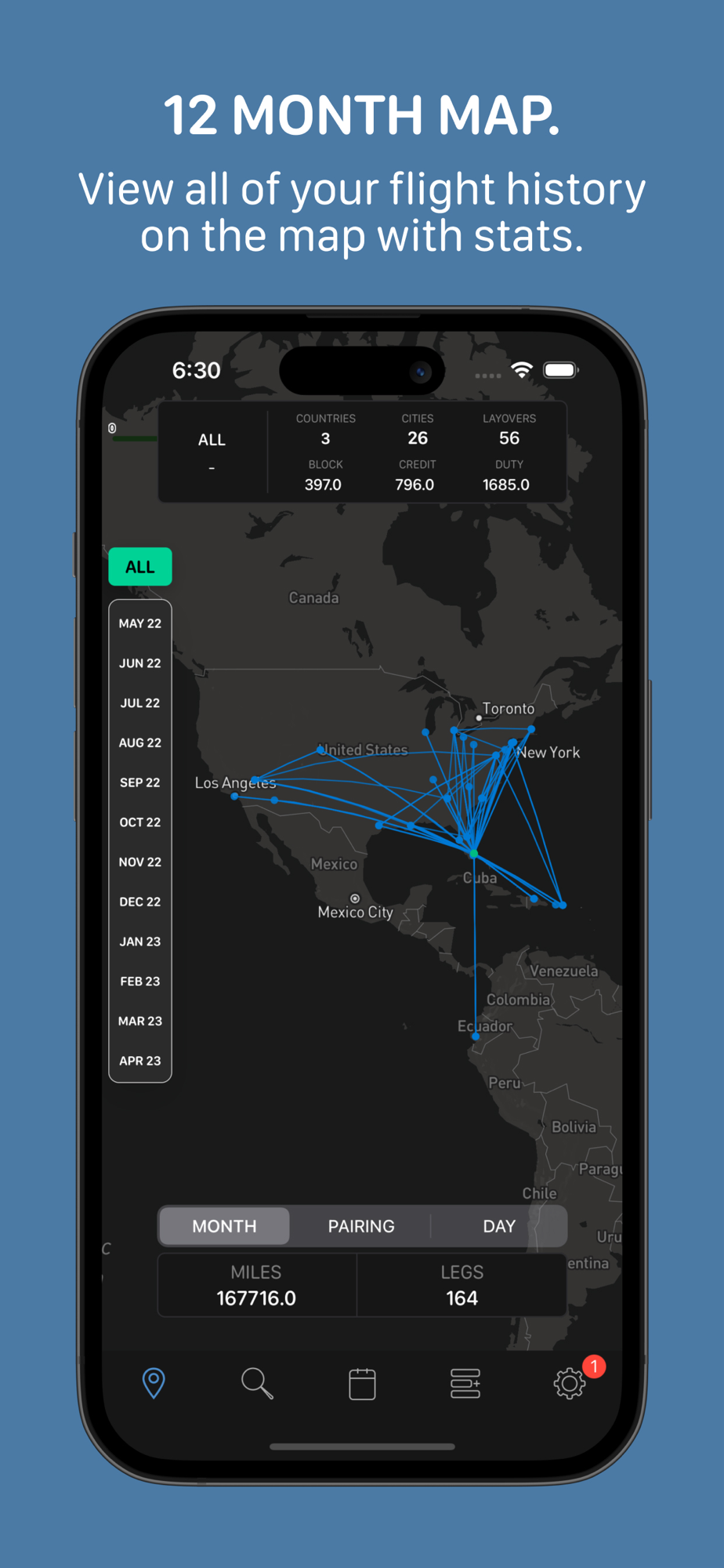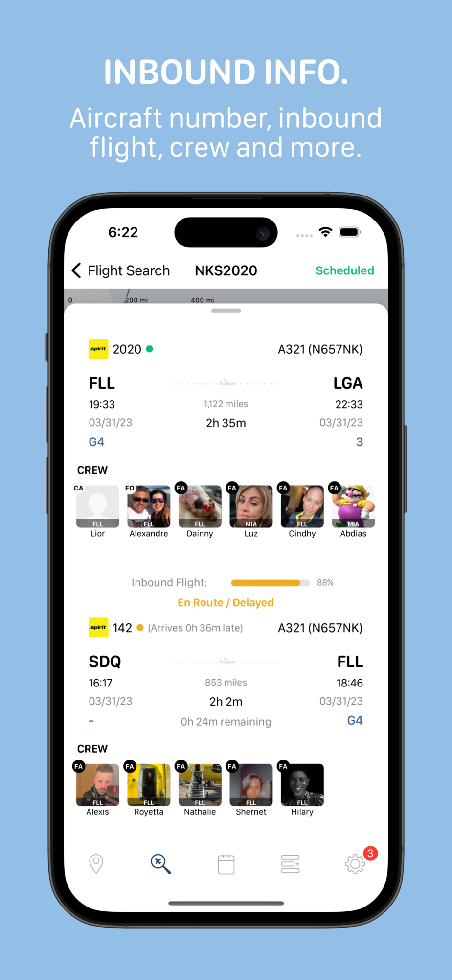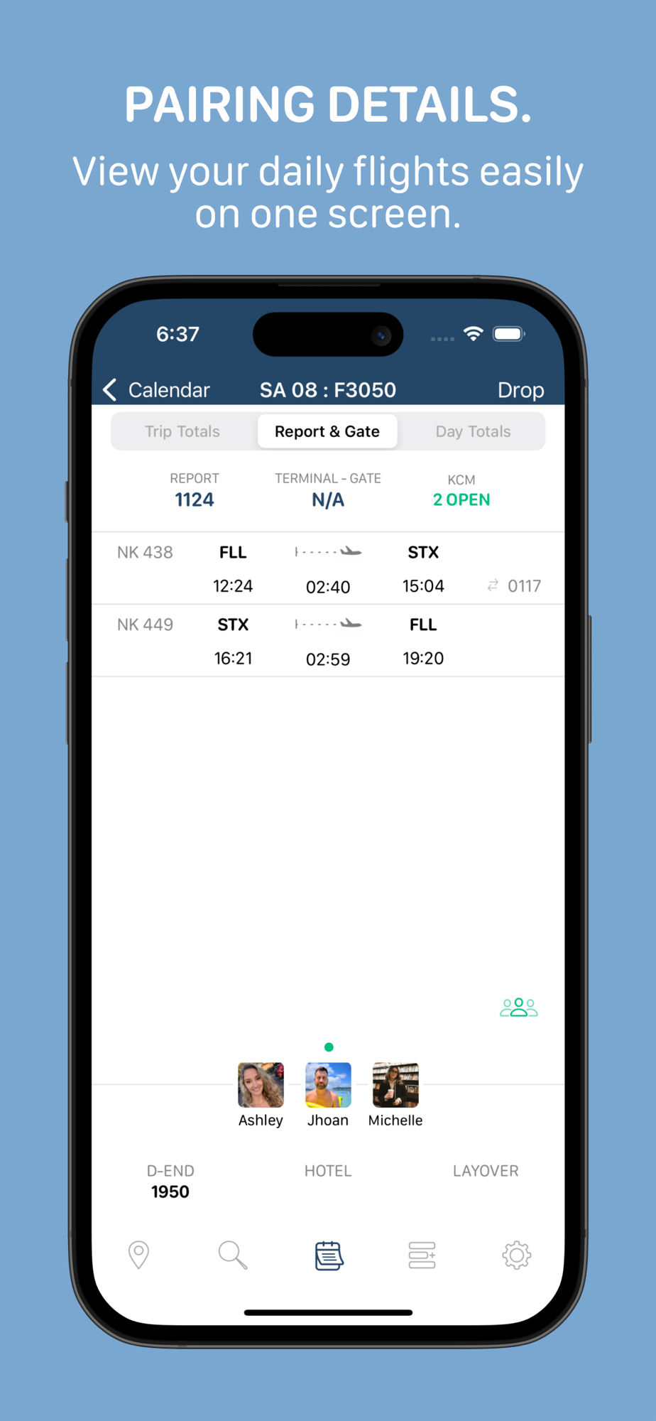 When you start your pairing, you will be presented with flight status information as well as the gate which you should report to. You’ll also notice a flight status indicator ( green = on time, yellow = delayed, red = canceled ) right next to each flight for the day.