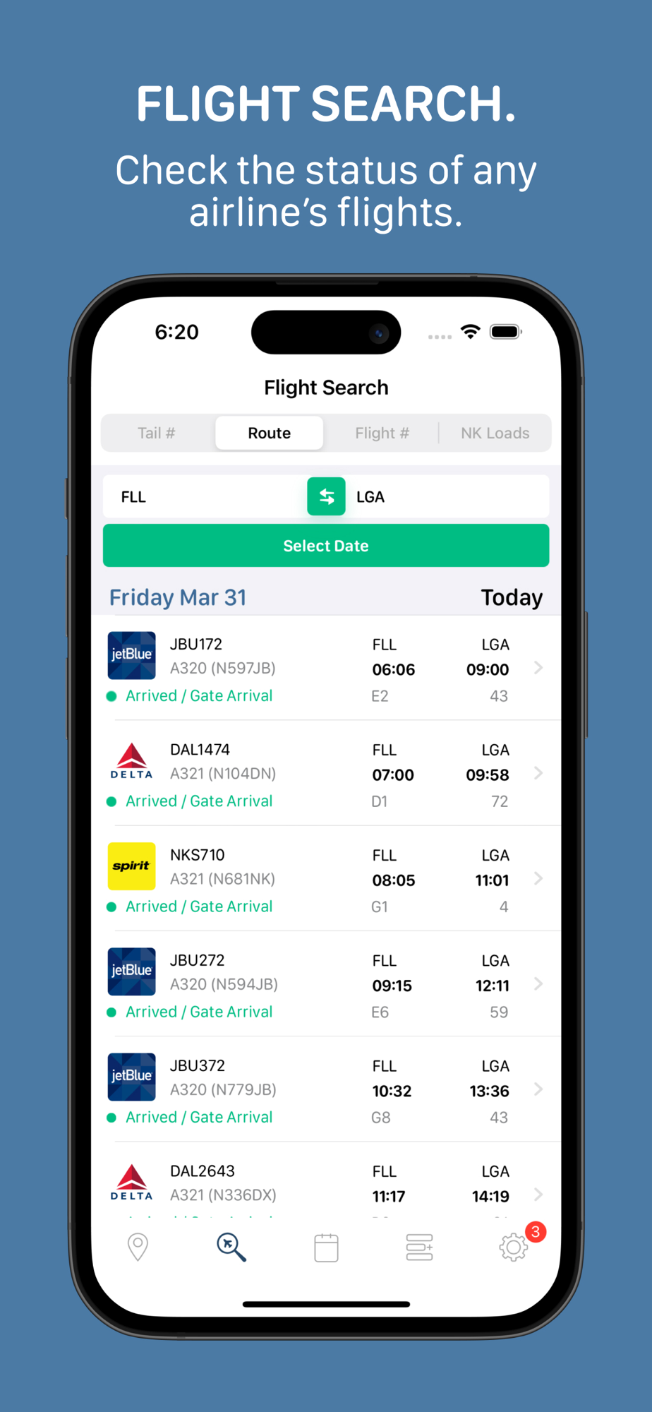 First Class: Includes everything plus advanced flight status and flight search. With the advanced flight status, you can see all the details about a specific flight or flights you are scheduled to work, including tail number, distances, aircraft type, and more.