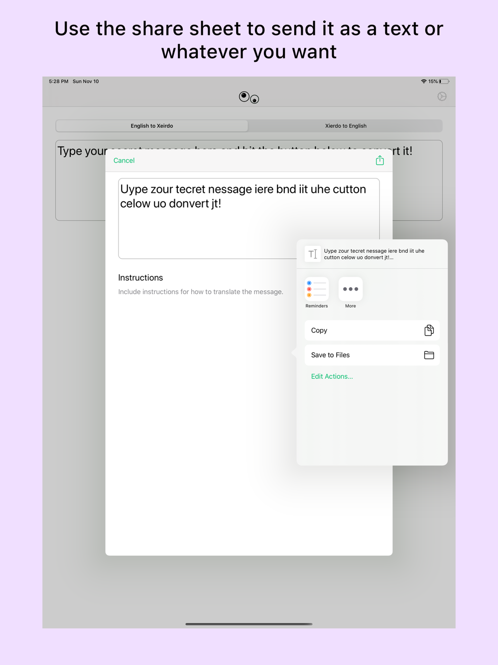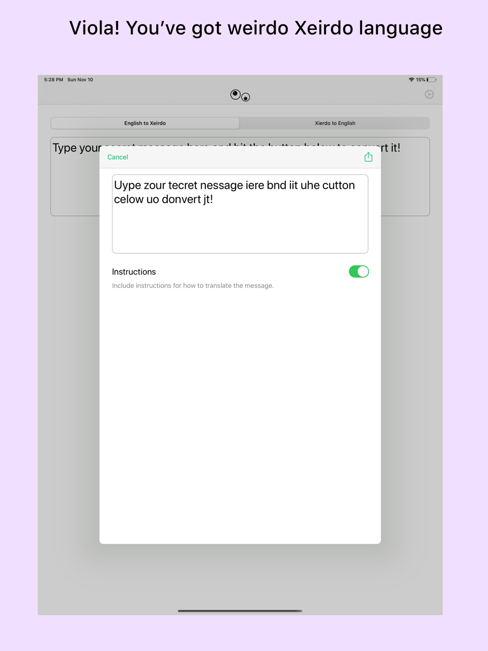 Xeirdo gives you a fun way to send secret messages to your friends. Convert your message with the tap of a button and you're ready to send it.