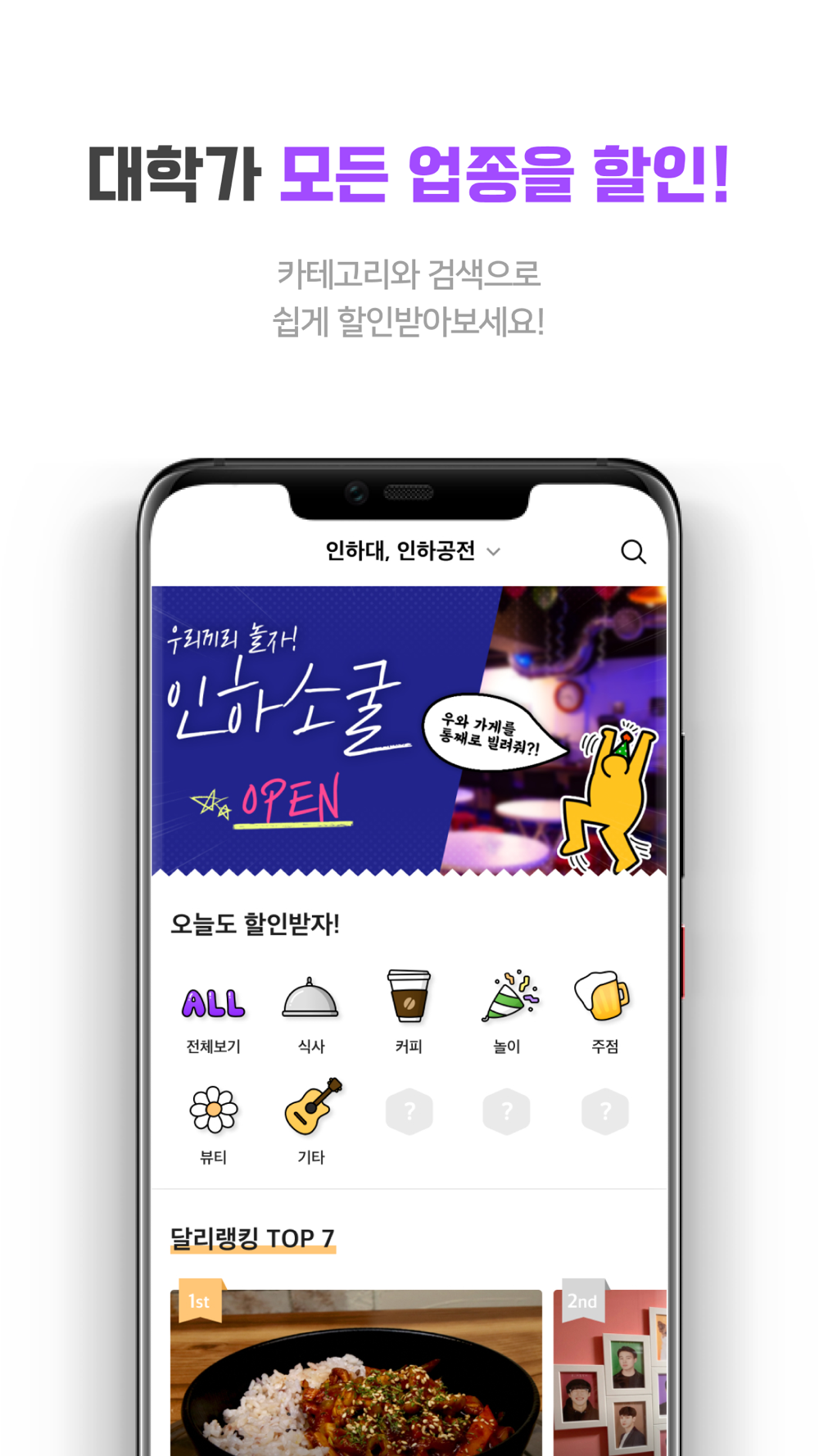 달리에서는 식당, 술집, 카페는 물론 이색카페, PC방, 노래방과 같은 문화생활, 세탁소 등 당신의 모든 일상 생활에서 할인을 제공하고 있습니다.