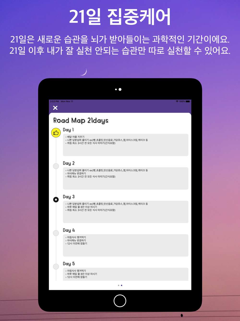 21일이라는 명확한 목표가 동기부여 향상에 도움이 되요. 또한 21일은 뇌가 새로운 습관에 익숙해지기 시작하는 과학적인 기간이에요.