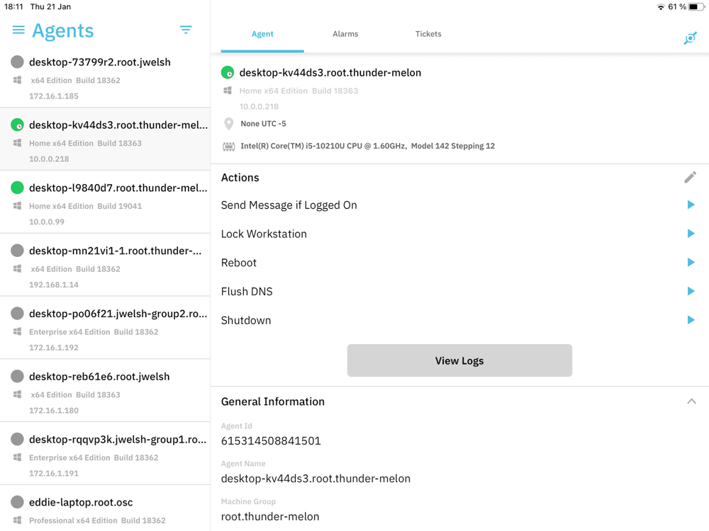 Kaseya VSA integrated with BMS tickets on your mobile device, enables technicians on the move to quickly access asset and agent information on tickets. See the status of the agent and see what endpoints are online and offline, all while seeing the latest audit information about endpoints.
