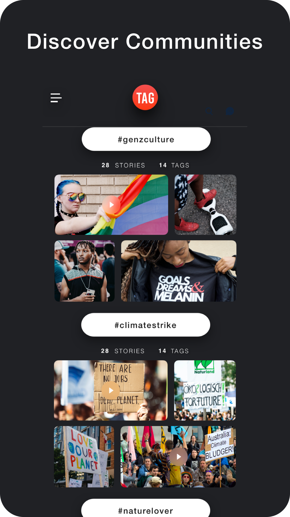 Connect with others, influencers and brands who share the same interests and values as you via micro-communities. TAG focuses on taking actions to impact the change you want to see in the world.