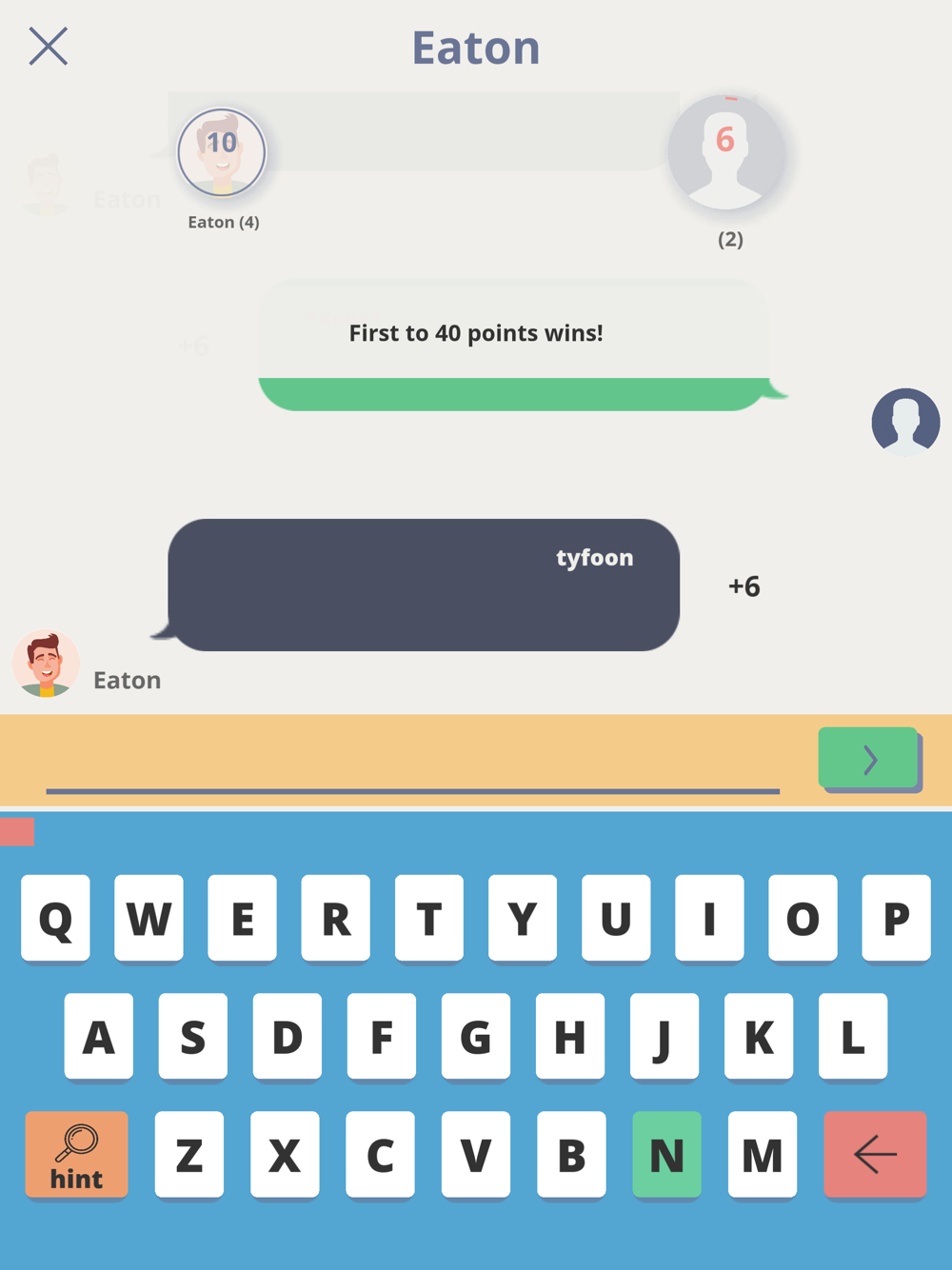 - Player scores by typing a word in his turn, the number of points corresponds to the length of the valid word.