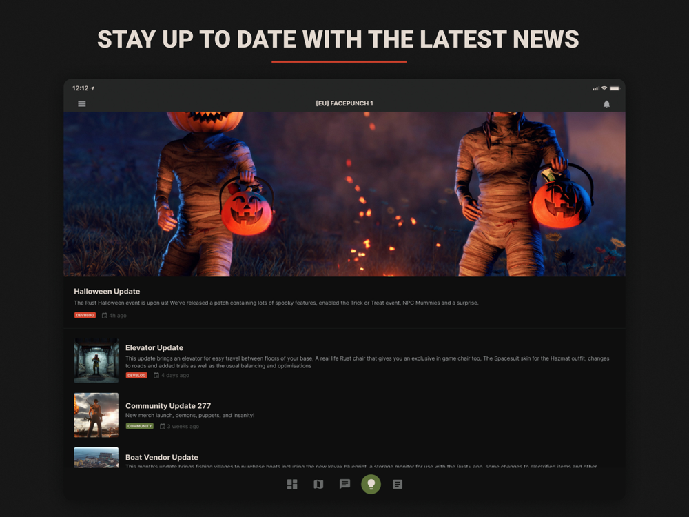 Pair with your favorite Rust servers to receive real-time updates for the things that matter the most: player counts, current game time, online teammates, and more. You’ll also get (optional) push notifications whenever one of your teammates joins the game.
