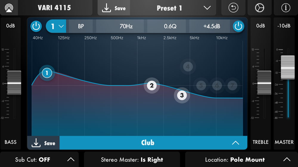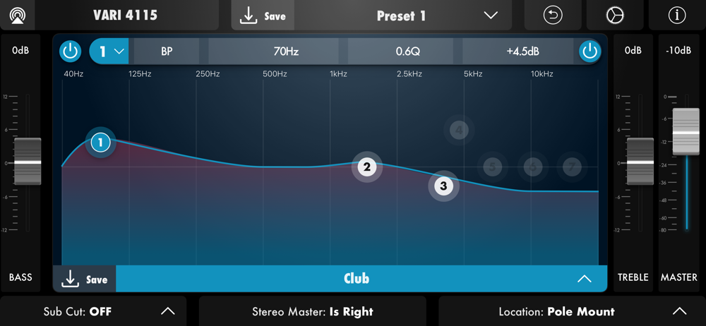 The VARI 4000 app lets you control your VARI 4112 or VARI 4115 powered speaker wirelessly, from the audience position, to get the ideal sound for your venue and application. Customize any Voicing, with 7 bands of parametric EQ, and save your personal settings to the VARI's hardware memory so they'll be available any time, with or without the app. Control the master speaker of a Smart Stereo setup, and hear every adjustment in real time from all speakers in the Smart Stereo setup.