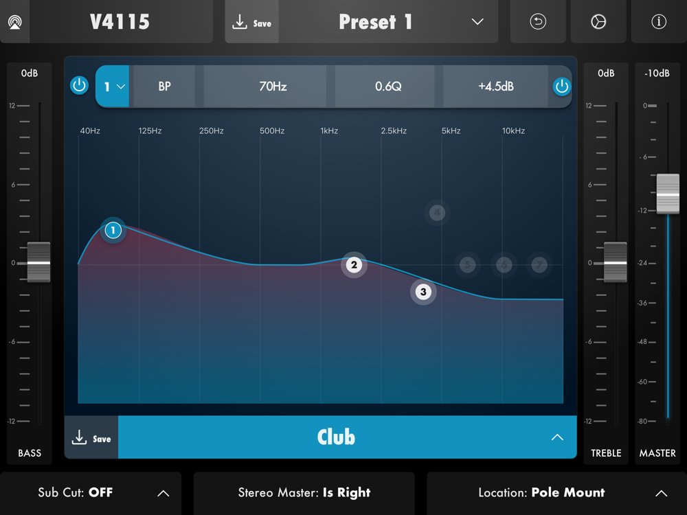 • Master Volume, Bass and Treble – these are knobs on the hardware, and controlled by sliders in the app