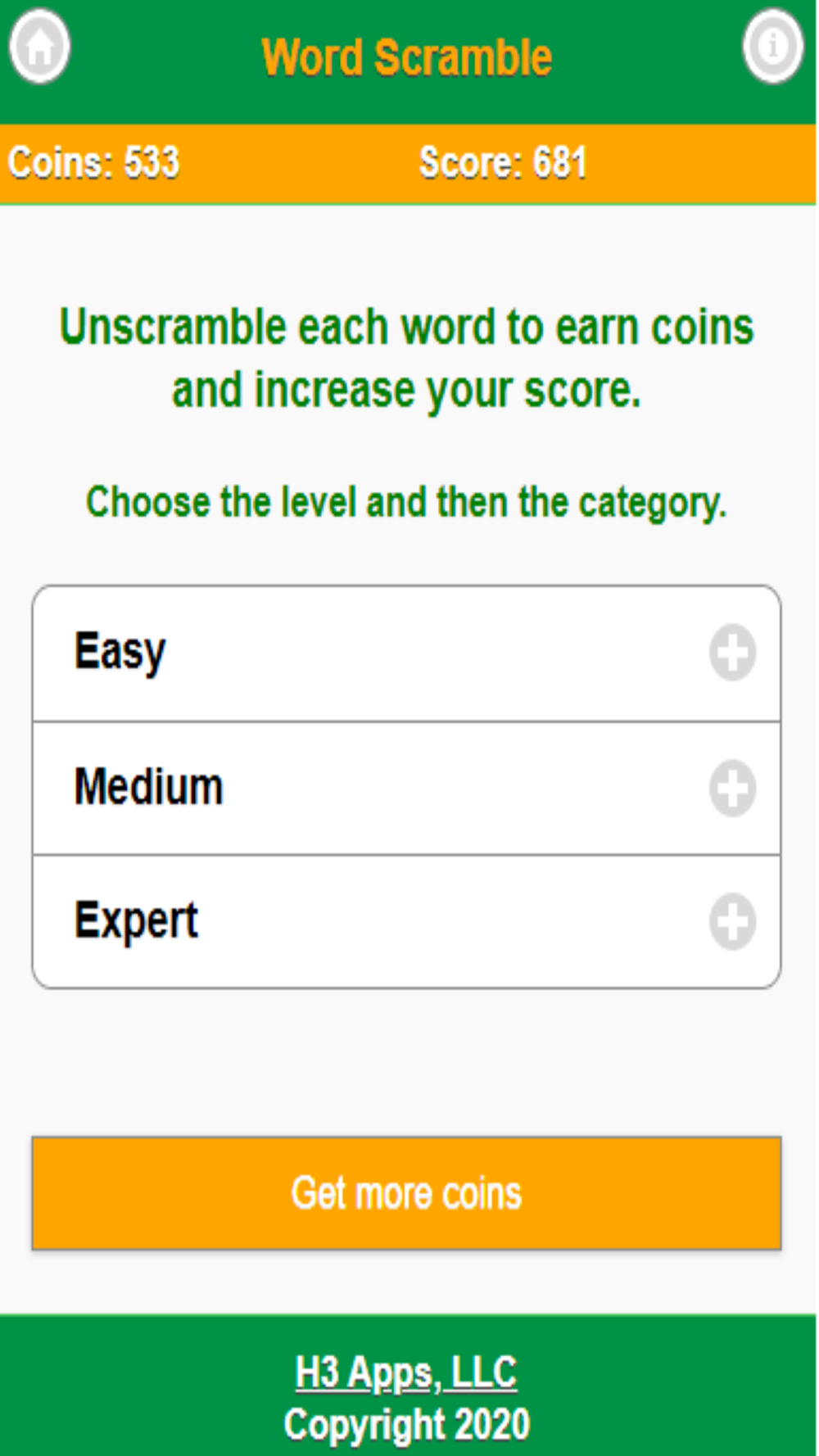 Earn coins and add to your score as you unscramble the letters to find the correct word. There are three levels of easy, medium, and expert with ten categories at each level.