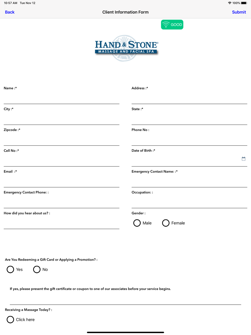Hand and Stone Intake form is for salon clients to fill intake forms.