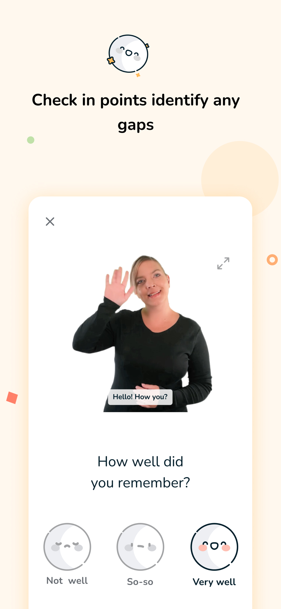 Bright BSL enables you to learn British Sign Language anywhere and at any time in a fun and effective way. The learning experience consists of 20 modules, each on a different topic and with specific learning outcomes. Within each module, you will have 4-7 gamified lessons, through which you will acquire new signs, practice mastery, learn about the grammar and continuously learn a new language. While our AI ensures that skills are not only learnt, but retained over time.