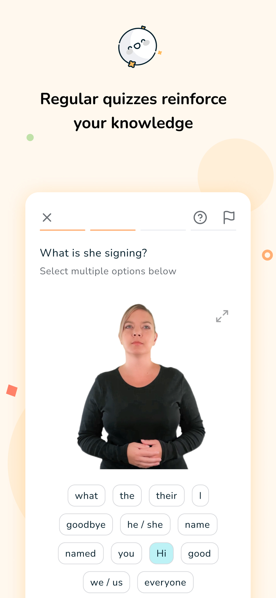 - 20 modules with 120 lessons and 500+ signs and sentences