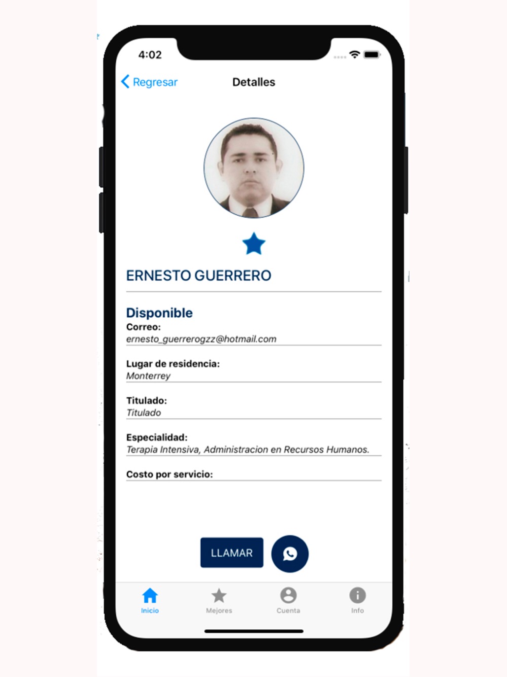 Esta aplicación tiene el objetivo de comunicar a los Profesionales en Salud con los pacientes que requieran de un servicio en enfermería de grado bajo, mediano o alto dependiendo de sus necesidades, por medio de un catálogo de opciones altamente calificadas previamente. La comunicacion es via telefonica o WhatsApp, quedando los detalles del servicio a disposición entre paciente y el Profesional de la Salud.