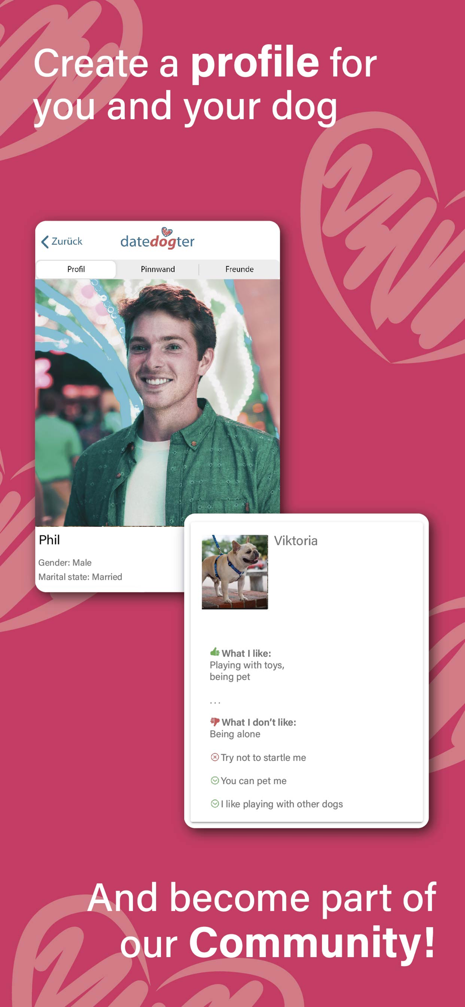 Datedogter is where you make new friends. Walk together, date, meet spontaneously and become part of a whole new "woof" factor community. Your Datedogter map shows who is currently out and about in the vicinity with or without their four-legged friend. Where is the next VIP point? Be curious. With one click you can find new friends, places and maybe the great love. But our app also warns you about poisoned bait and other dangers. The perfect heart app for your pocket. Get the "woof" factor. Love happens, always and everywhere.