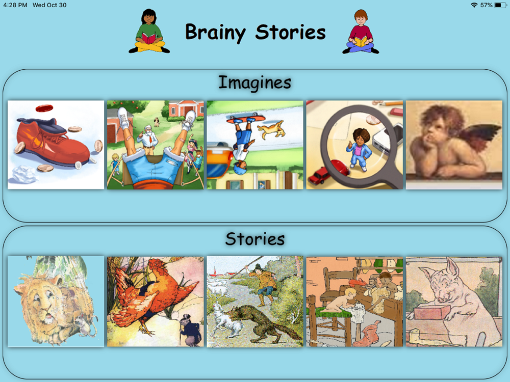 Educational research demonstrates that children who often listen to stories achieve far more success in school and in life, but watching too many cartoons and videos adversely affects child development. Brainy Stories 1 relies on individual pictures, stimulating a child's imagination, in contrast to cartoons and videos which stimulate a child sensually but dull a child mentally. Our 10 texts introduce new vocabulary words, longer and more complex sentence patterns, essential usage and grammar examples, vital literacy elements young children's brains are especially designed to absorb between ages 3 and 9, though they find it increasingly difficult to absorb in later years. Our 5 'Imagines' encourage a child to conceptualize new experiences such as being only a few inches tall or living in an upside-down world. The 5 'Stories' are all beloved classics: The Lion and the Mouse, The Little Red Hen, The Boy Who Cried Wolf, The Elves and the Shoemaker, The Three Little Pigs. A progress screen awards a choice of prizes (dragon, mermaid, puppy, etc.) and tracks how many times each Imagine or Story is heard. Each story has 2 'Can You Do It?' exercises to spur thoughts and activities.