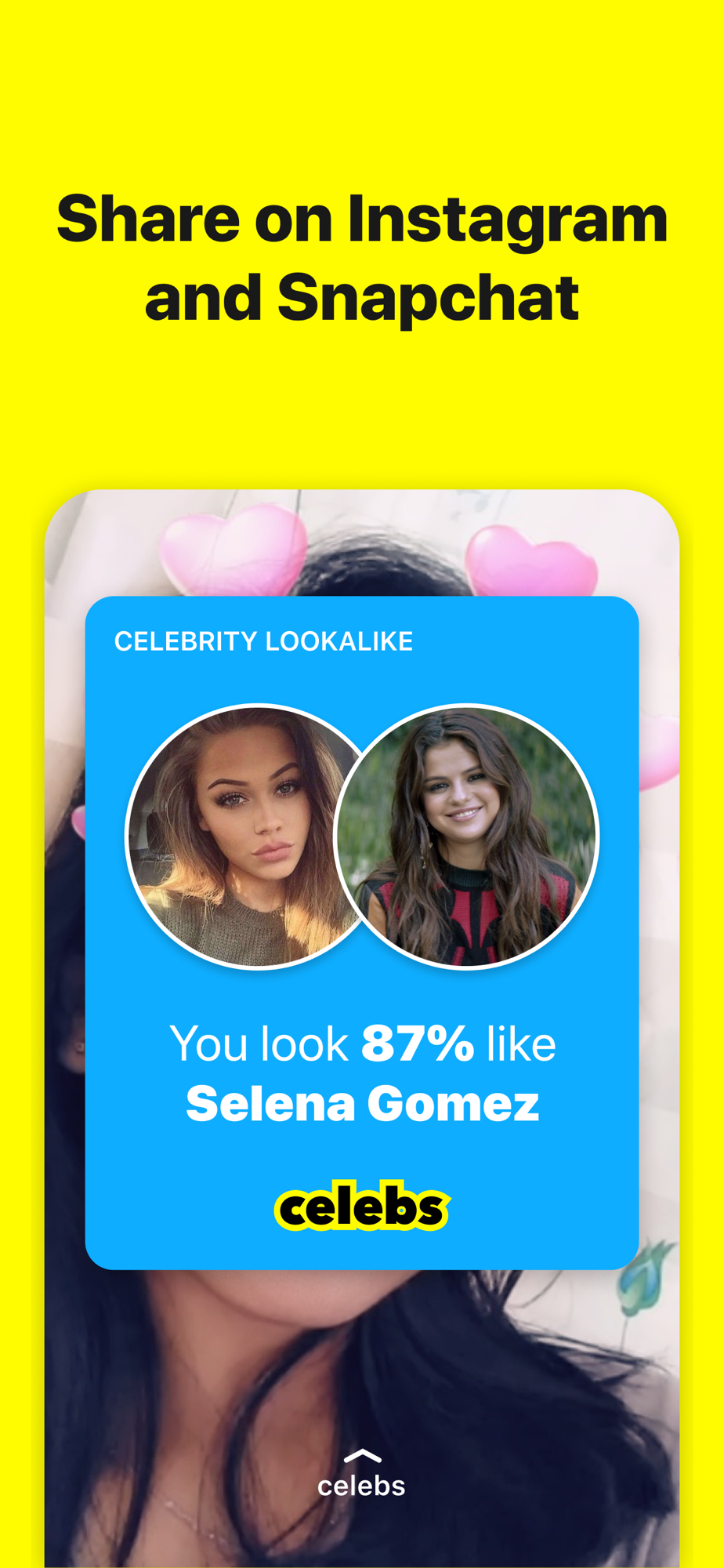 Results for Instagram and Snapchat stories: Share your celebrity lookalike results with friends on social media.