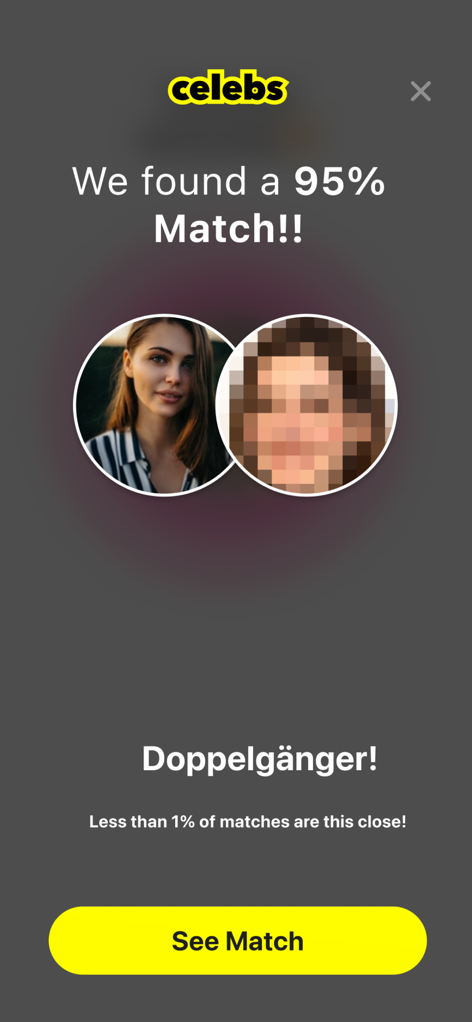 To help you find your celebrity doppelgänger, Celebs uses simple image classification and matching algorithms that run locally on the user's device (meaning that the images never leave your device) securely through CoreML. The algorithm used in Celebs does not use AI facial recognition technology as it's not used to identify you or other users on Celebs. Celebs does not have the following features or effects: human ageing, gender transit, face swap, or future baby appearance prediction references.