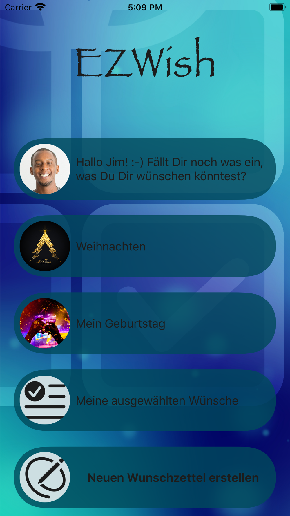 Mit EZWish erstellst Du ganz einfach Deine Wunschzettel - sei es für Deinen Geburtstag, Weihnachten, Hochzeit oder jeden anderen, beliebigen Anlass und teilst sie im Handumdrehen mit Deinen Freunden.