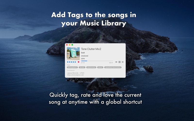 Anytime you’re listening to your music, use the configurable global shortcut (ctrl+alt+cmd+T by default) to quickly show MusicTagger and find details about the currently playing track and add or remove tags and comments.