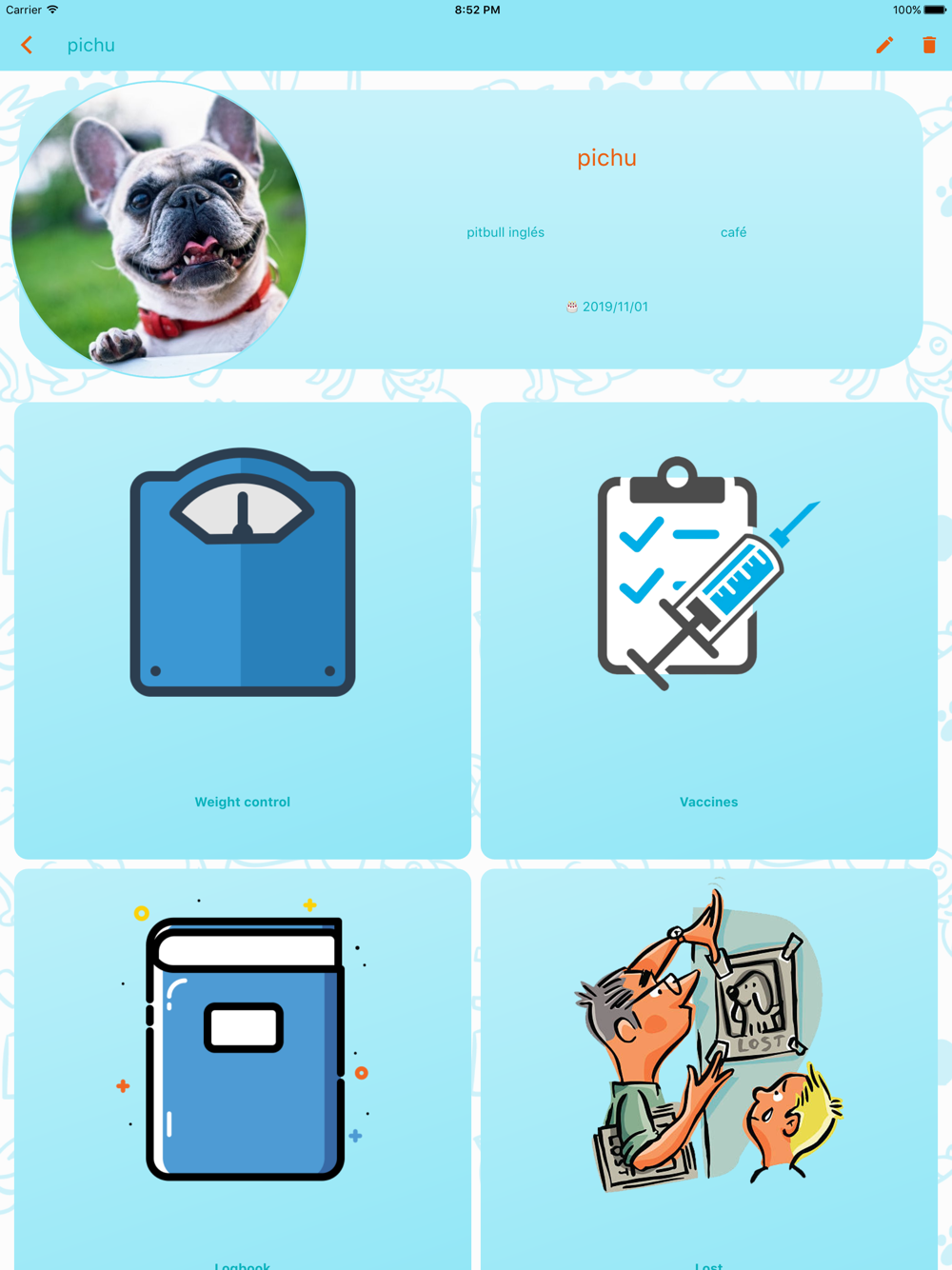 * Personal logbook for each of them, so you can save observations, discomfort or any data of your pets with or without photos with a specific date.