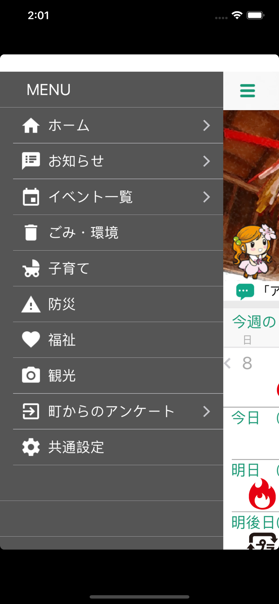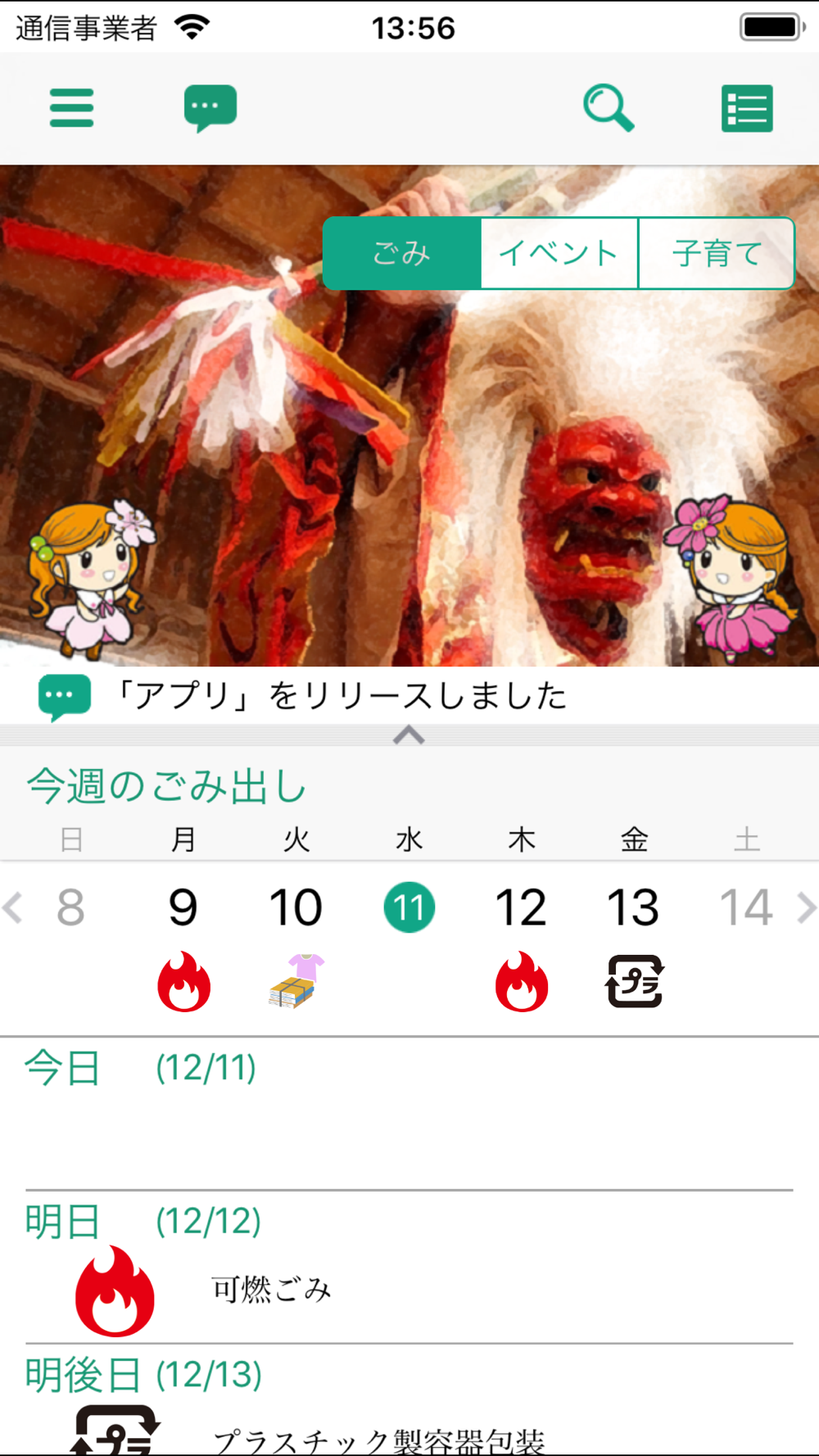 収集日変更のお知らせやイベント情報などを確認することができます。