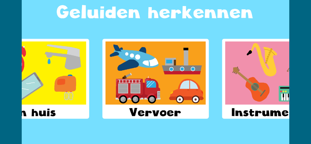 The application Recognizing sounds contains various sounds for children to practice. The sounds are subdivided into five categories, and each category contains 12 sounds. The categories are: