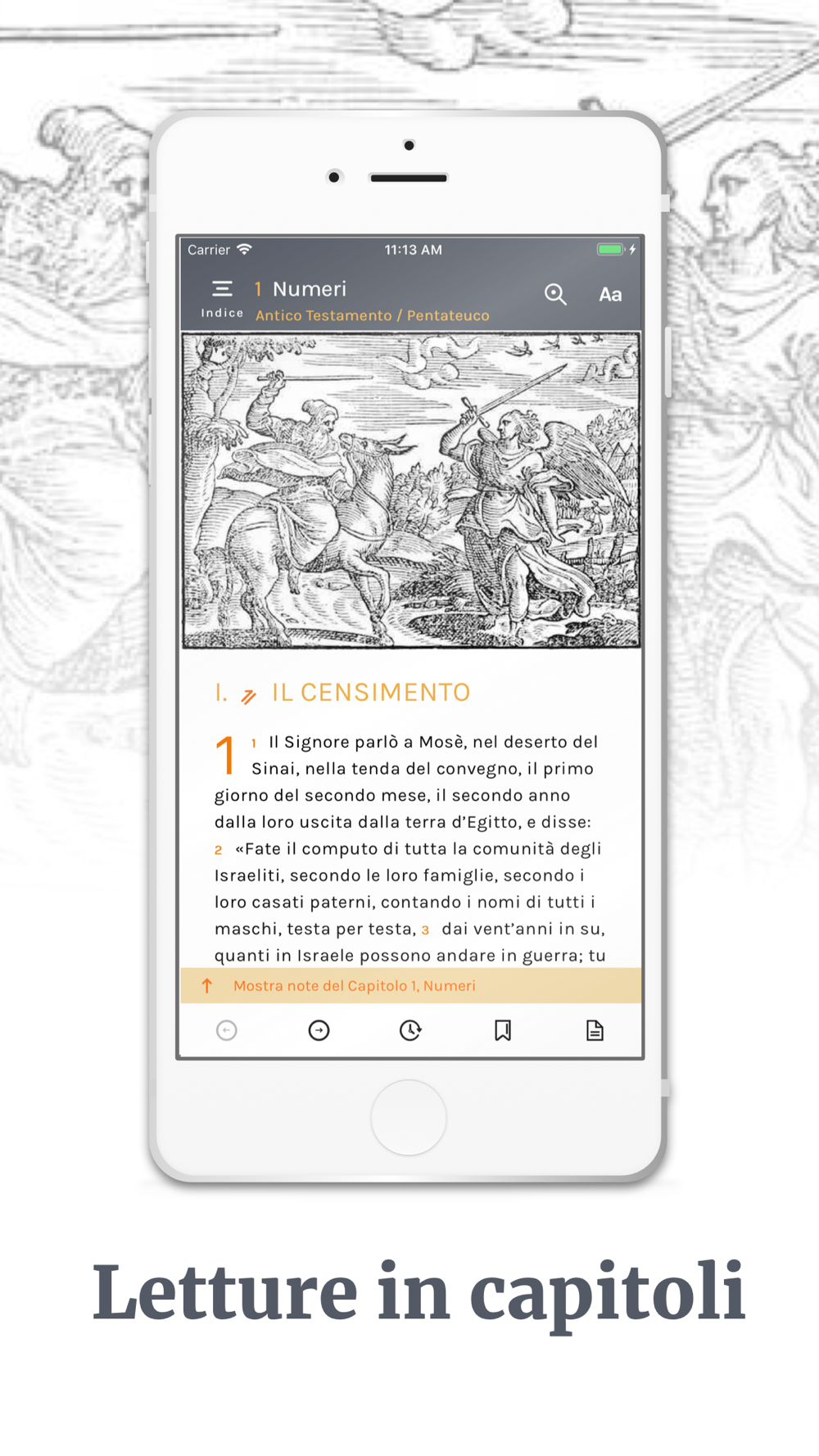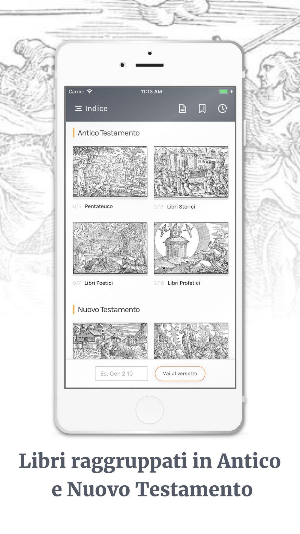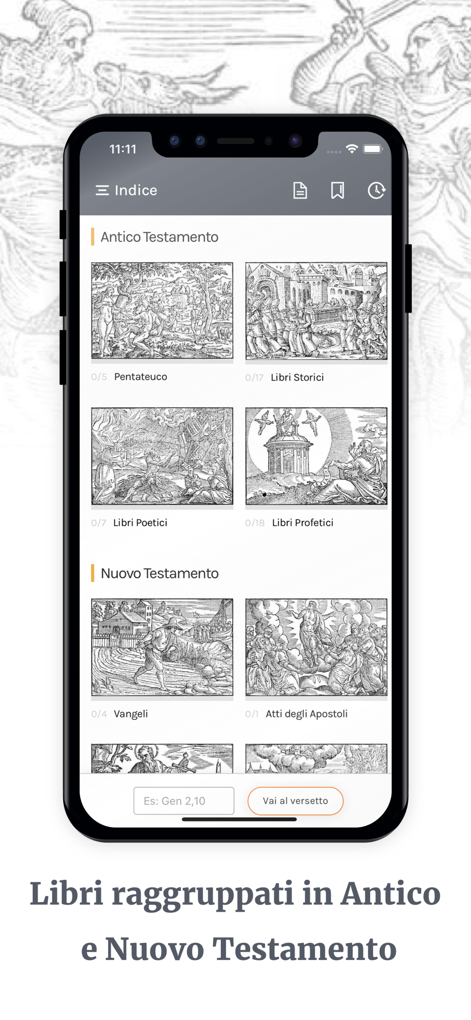 Le xilografie, riprodotte da una Bibbia del 1606 stampata “apud Iuntas” a Venezia (e precisamente dalla terza edizione di questa, del 1625), impreziosiscono l’app e costituiscono un vero commento visivo, che si svolge in parallelo a quello letterario e teologico.