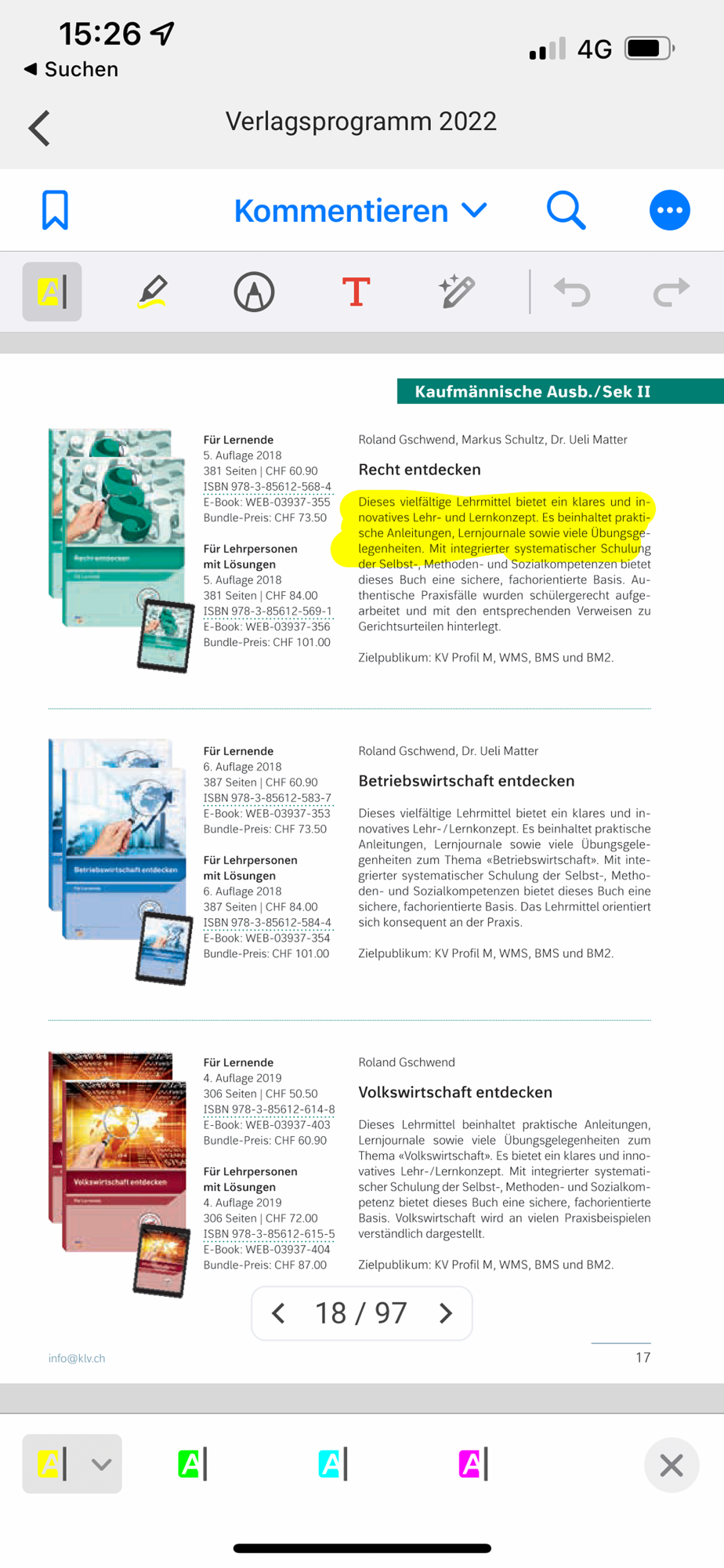 Im eBooks KLV Verlag App können Sie die Lehrmittel, Repetitorien und Nachschlagewerke vom KLV Verlag als E-Books beziehen. Die App ist kostenlos und bietet Ihnen von jedem Titel eine kurze Leseprobe zur Voransicht. Mit verschiedenen Zusatzfunktionen finden Sie sich rasch im E-Book zurecht und können einfacher und schneller damit arbeiten.