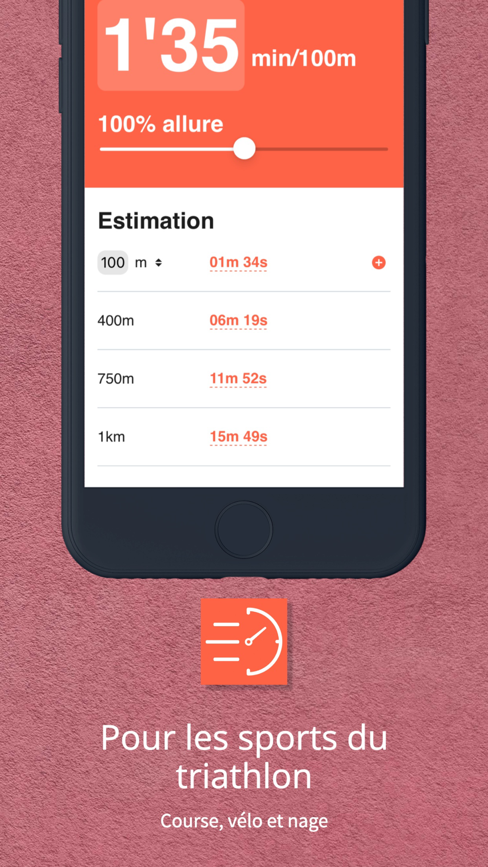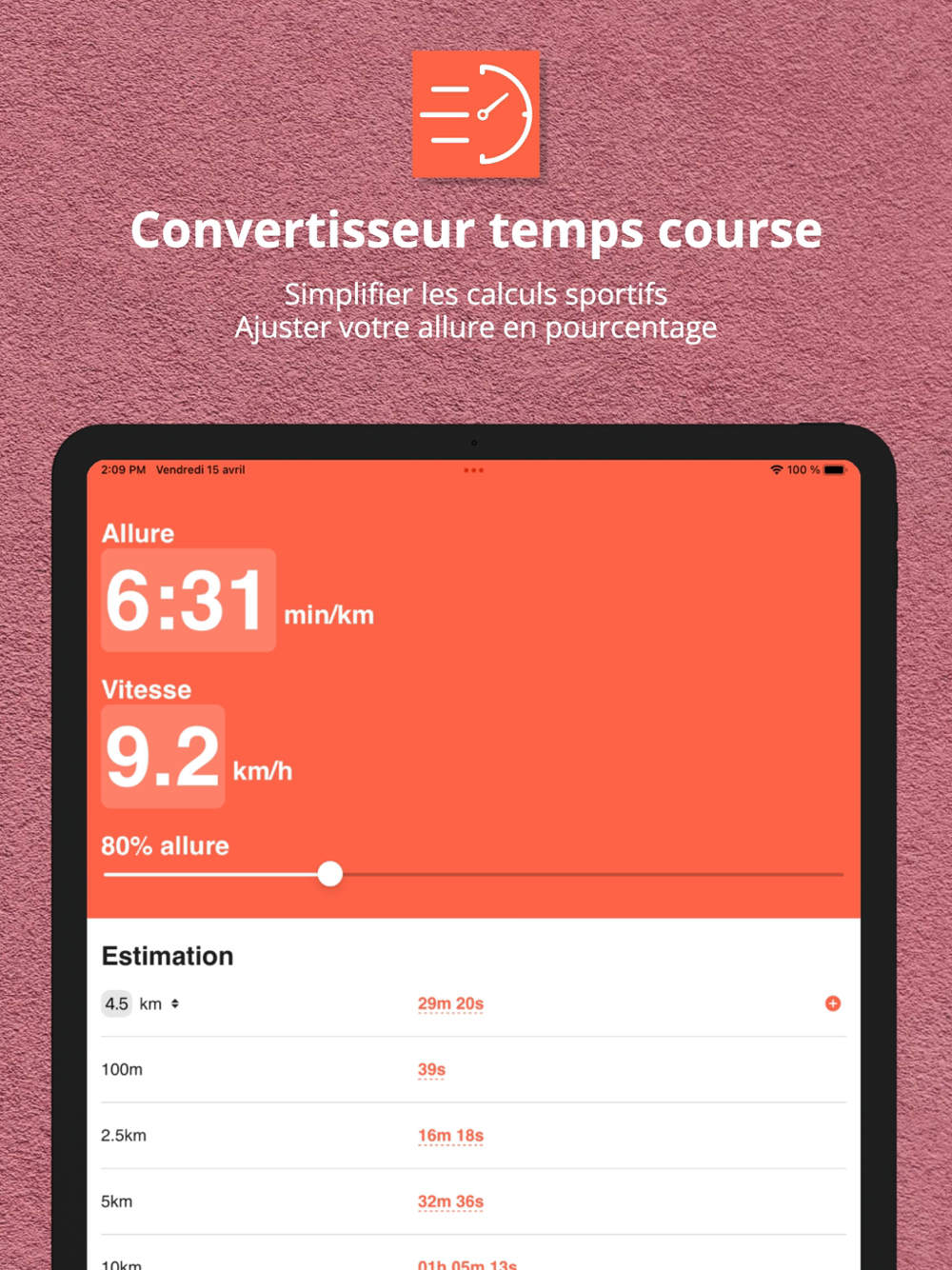 You can also modulate your pace as a percentage, in order to estimate your times over your favorite distances. Example: 90% of 4:30min/km over 3km gives 15 minutes.