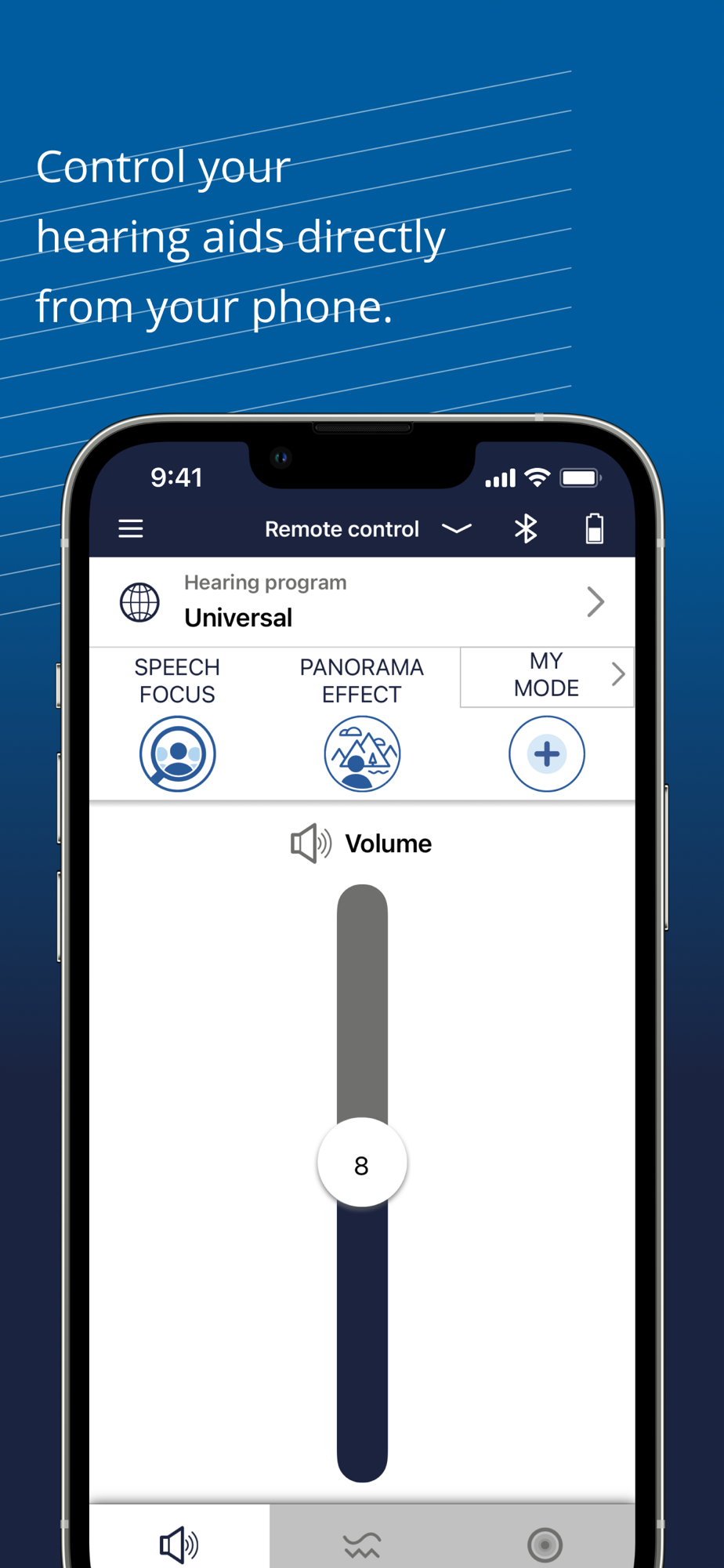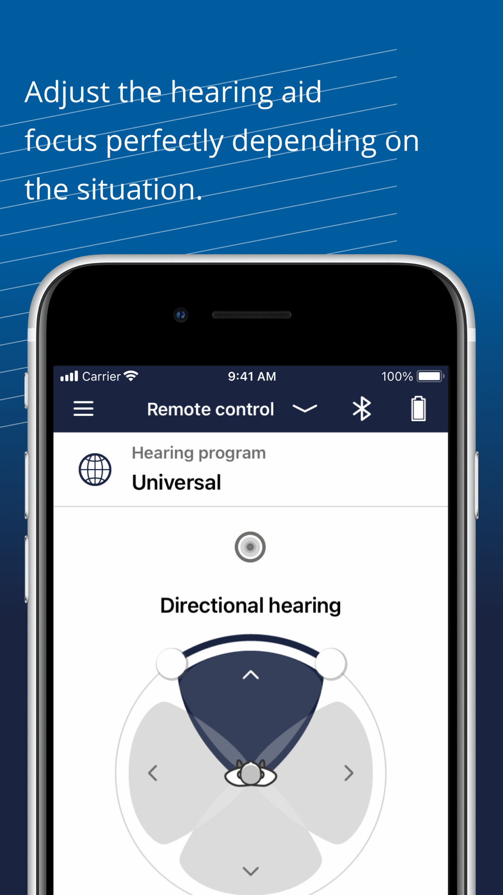 The indispensable app for all hear.com HORIZON hearing aid wearers. The hear.com HORIZON app allows you to discreetly control the pioneering hearing system from hear.com in complete comfort via your smartphone. Transfer multimedia content such as music or phone calls directly to the hearing aid, set different amplification programs and activate innovative functions such as SPEECH FOCUS, PANORAMA EFFECT and the world first MY MODE functionality. Thanks to the simple, intuitive user interface, you'll be able to use it right from the start.