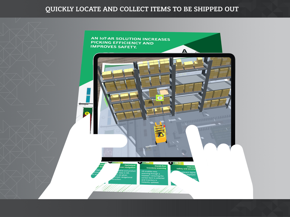 Use this app to experience two real-world IoT + AR solutions in augmented reality. Put yourself in the shoes of an employee performing a maintenance operation on an excavator or navigate around a warehouse to complete a picking order.