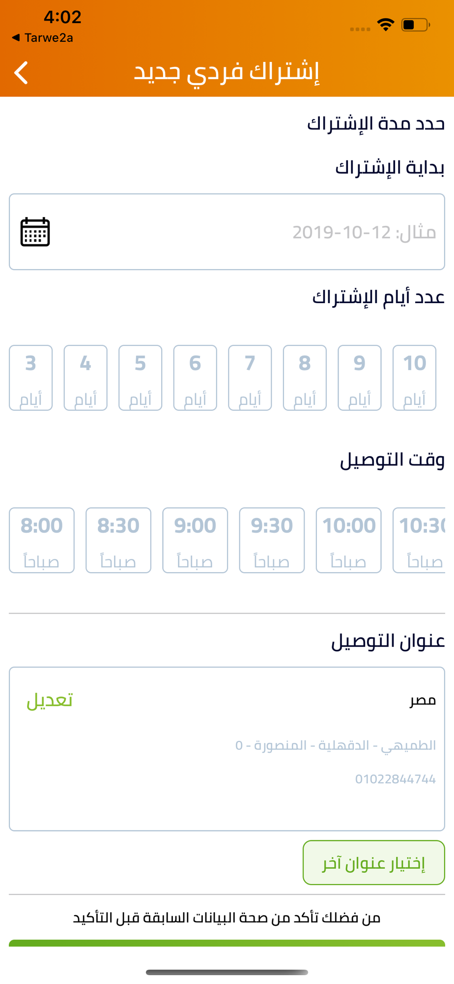 مع تطبيق "ترويقة" هتقدر تحدد فطارك كل يوم. سجل معانا اشتراك بدآ من 3 ايام وحدد الوجبة الي عاوزها توصلك كل يوم وموعد ومكان التوصيل اليومي. واستنانا كل يوم هنوصلك فطارك في المكان والميعاد الي اخترتة من غير ما تحتاج تطلب مرة تانية.