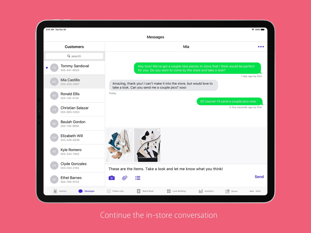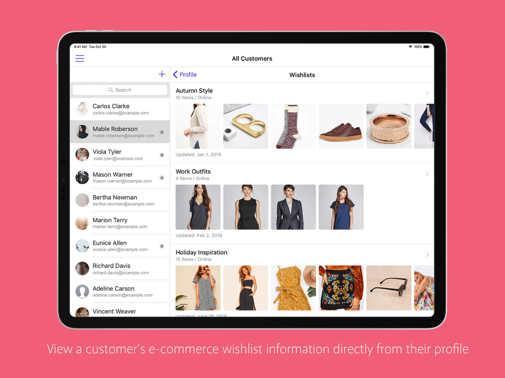 Clienteling delivers a personalized shoulder-to-shoulder experience for shoppers in your store and can transform one-time buyers into customers loyal to your brand. The app includes access to customer wishlist and order history, black book management, follow-up management, email and SMS messaging.