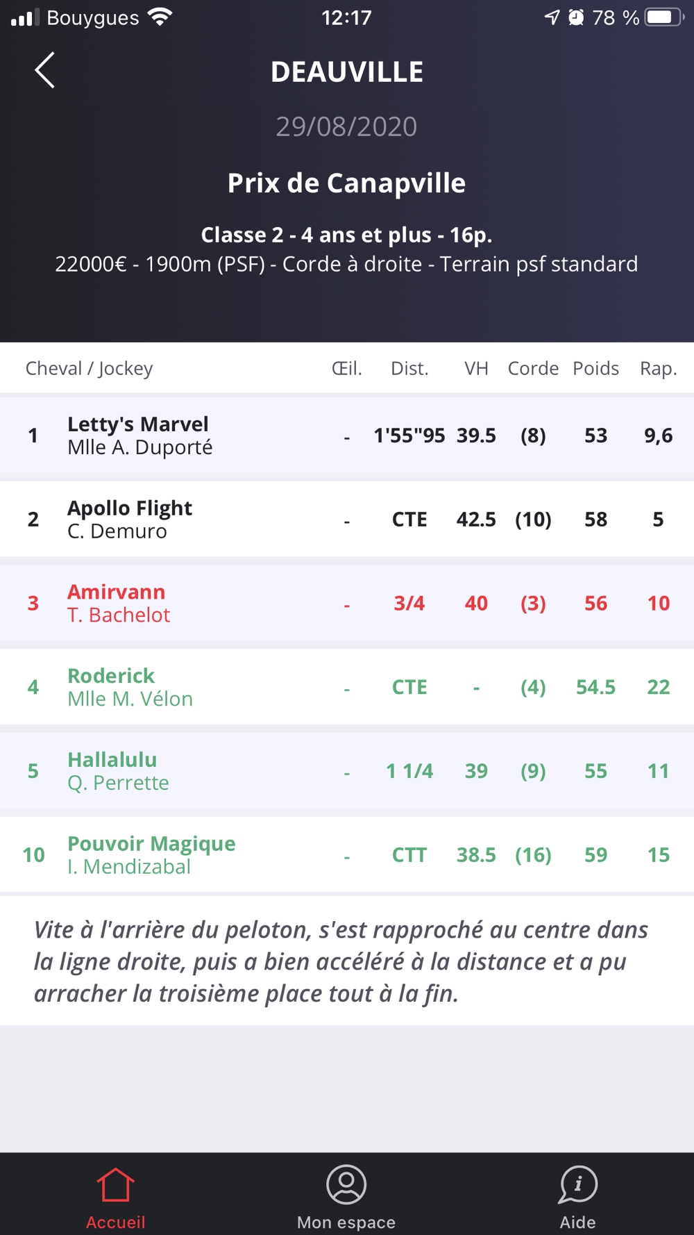 Approfondissez en ouvrant une fiche cheval : toutes les performances de la carrière sont listées.