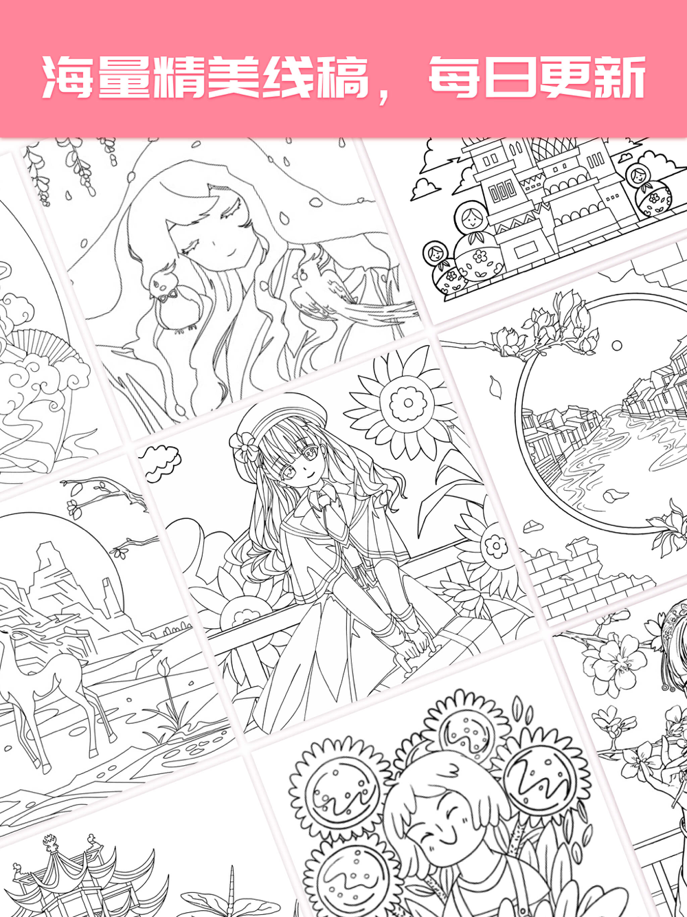 海量线稿:古风人物、可爱漫画等应有尽有,找出你喜欢的主题进行涂色