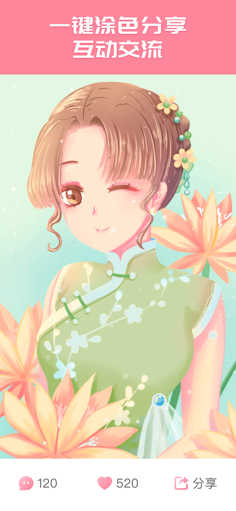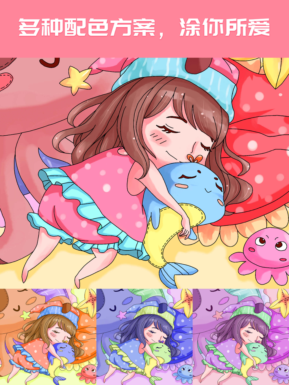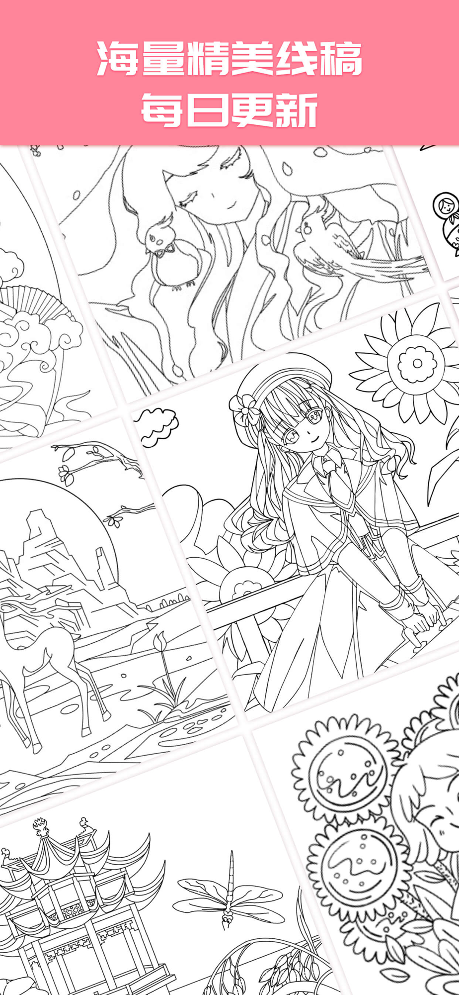 有数千张富有创意而风格独特的精美画作让你选择,还有多种配色方案,涂你所爱。无论是唯美朴素的纯色绘本、还是独树一帜的精品彩绘画作,所有画作都经过我们的插画师精心设计,素材丰富多样,古风人物、可爱漫画、花卉、动物等多个分类供您挑选,只为了让您的艺术作品更加耀眼。