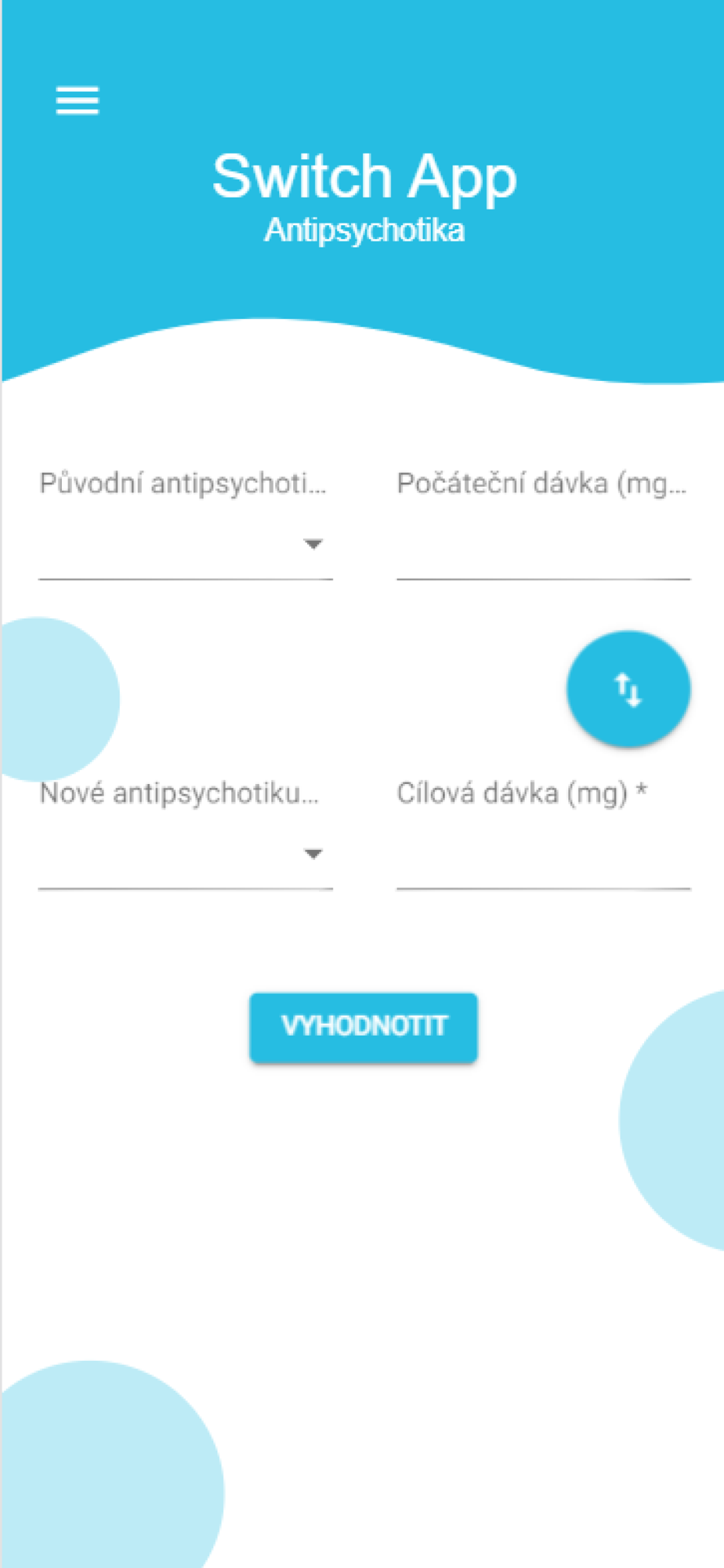 SwitchApp aplikace určená pro odborníky ve zdravotnictví pro zobrazení doporučeného postupu při změně terapie u antipsychotik a antidepresiv.