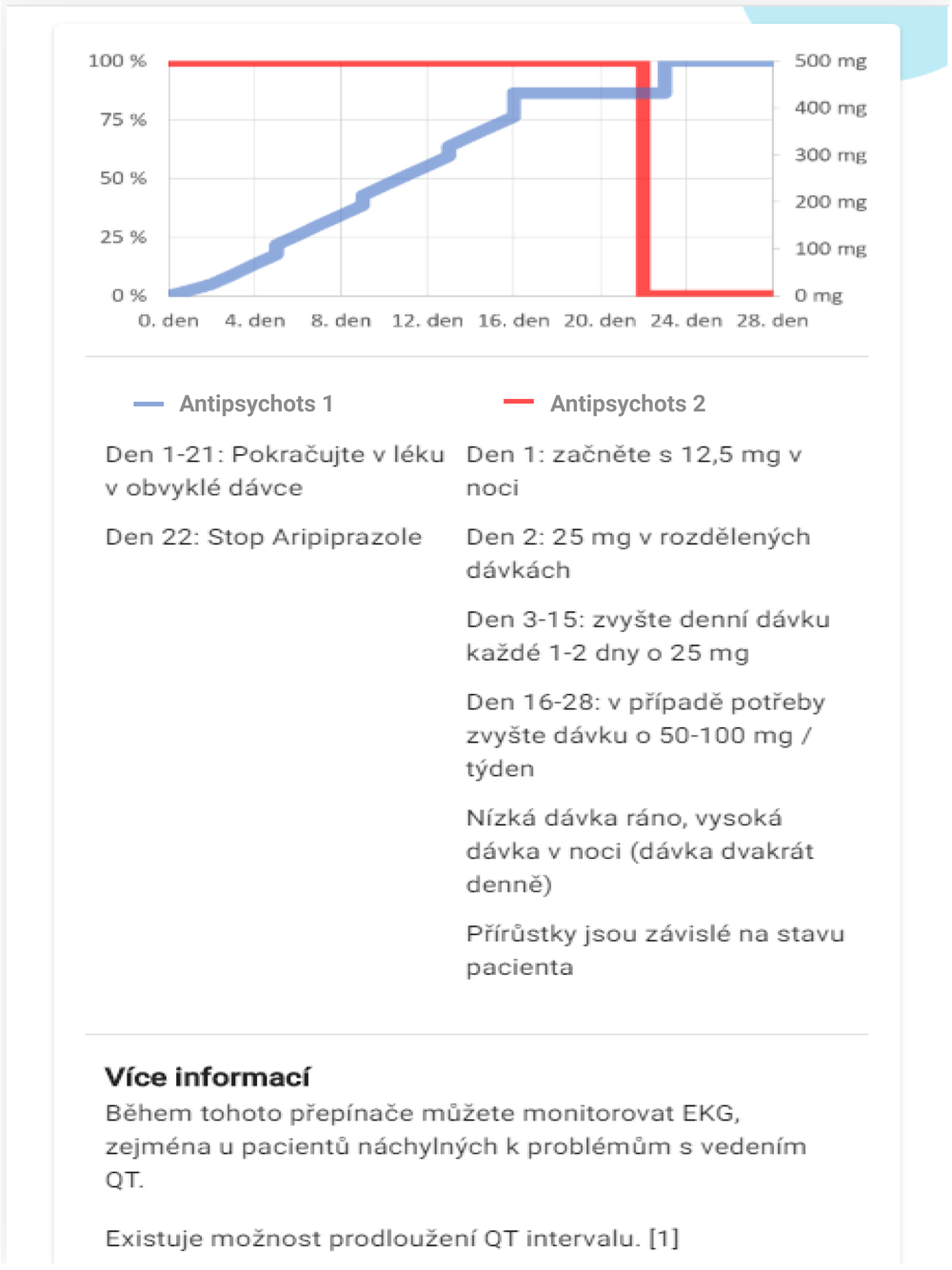 Aplikace zobrazuje doporučené dávkování jednotlivých účinných látek při změně terapie u pacienta léčeného určitým antipsychotikem nebo antidepresivem.